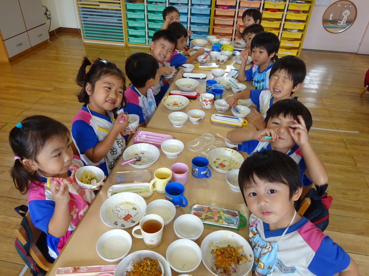 机をながーく並べて給食を食べました!