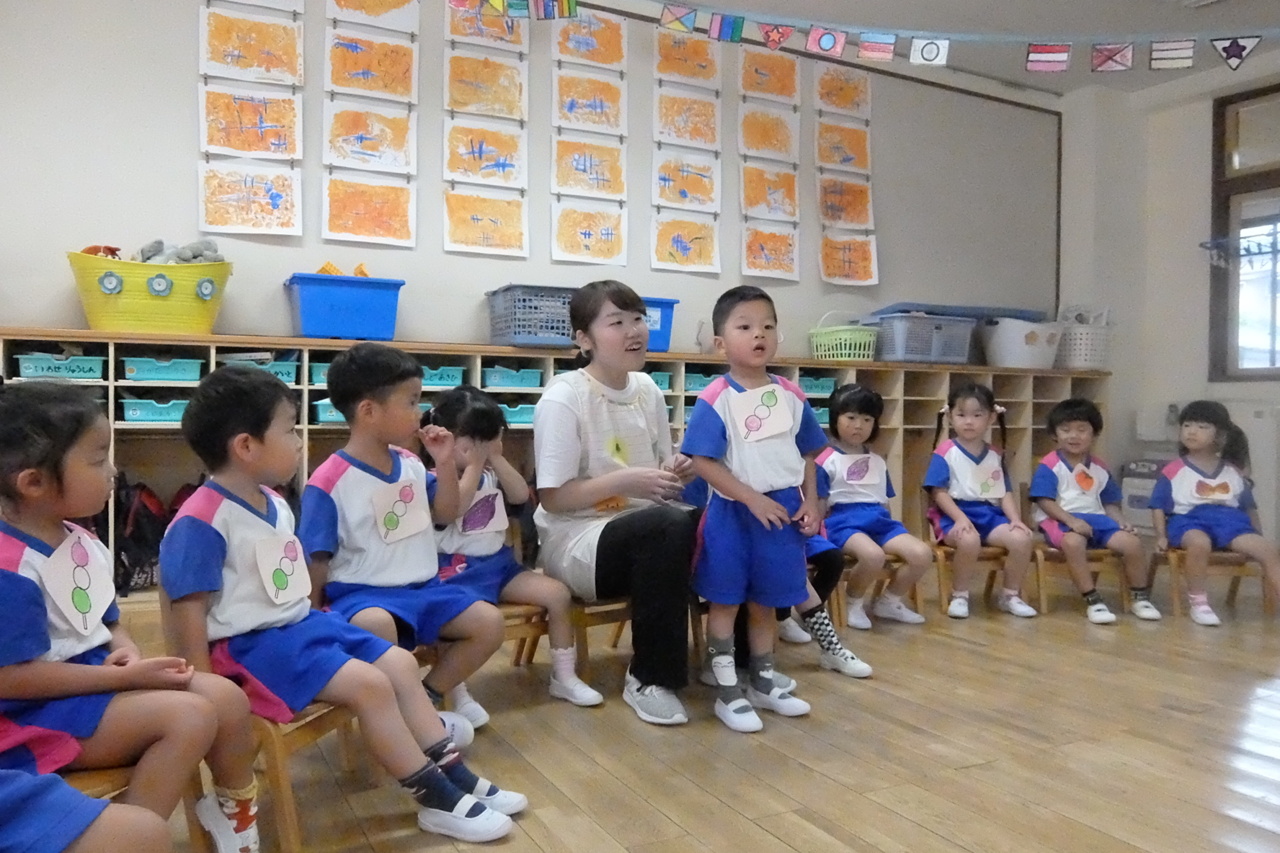 お月見バスケットをして楽しみました! みんなの胸に付いているカードは、自分で上手に色を塗りました(^^)