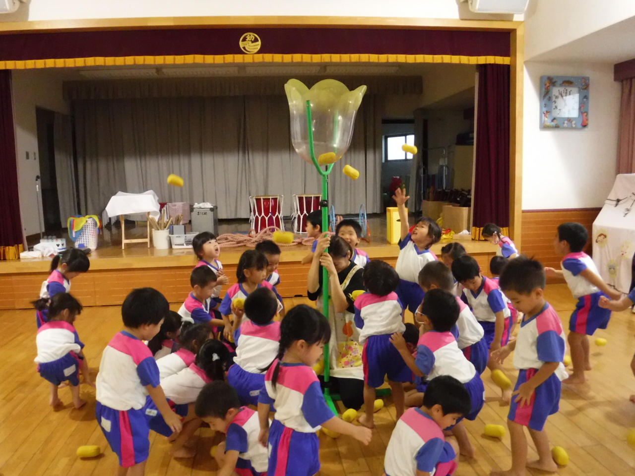お部屋ではボール運びリレーをしました!
