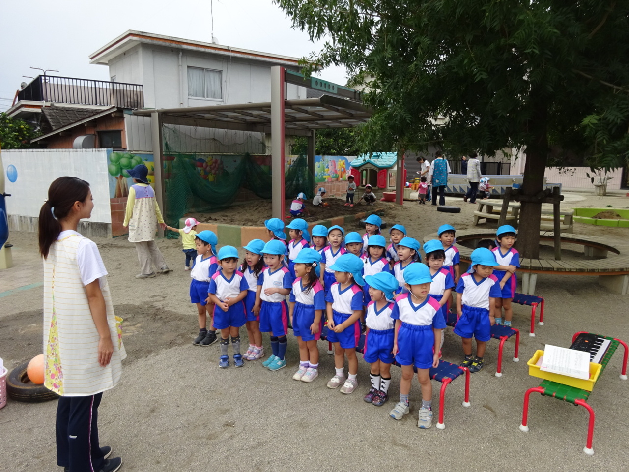 気持ちの良い天気なので、いつもとは違うお外での朝の活動です!!