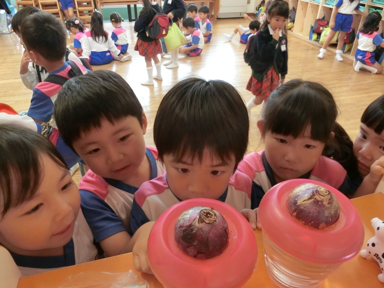 真剣にみているのは、ヒヤシンスの球根! みんなで生長を見守っていきたいと思います☆