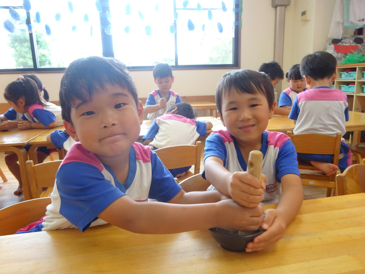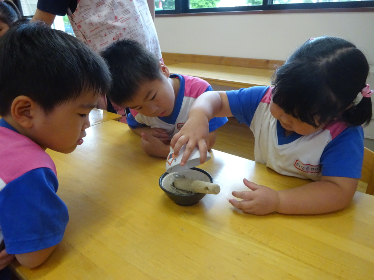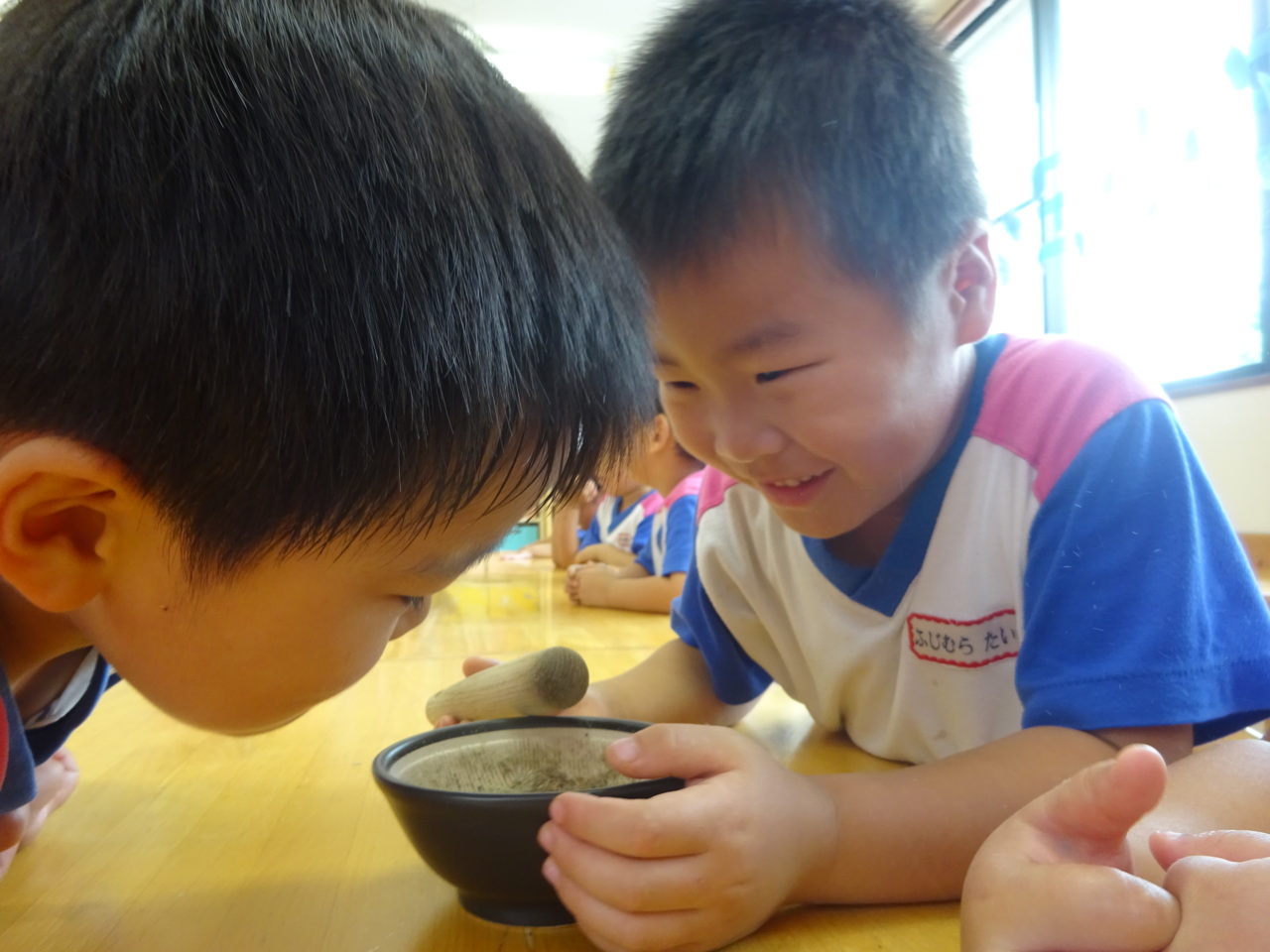 さいとうさんにすり方を教えていただきました♪ お友だちがやっているときは、すり鉢を持っていてあげたりと、優しい姿も見られました(*^_^*)