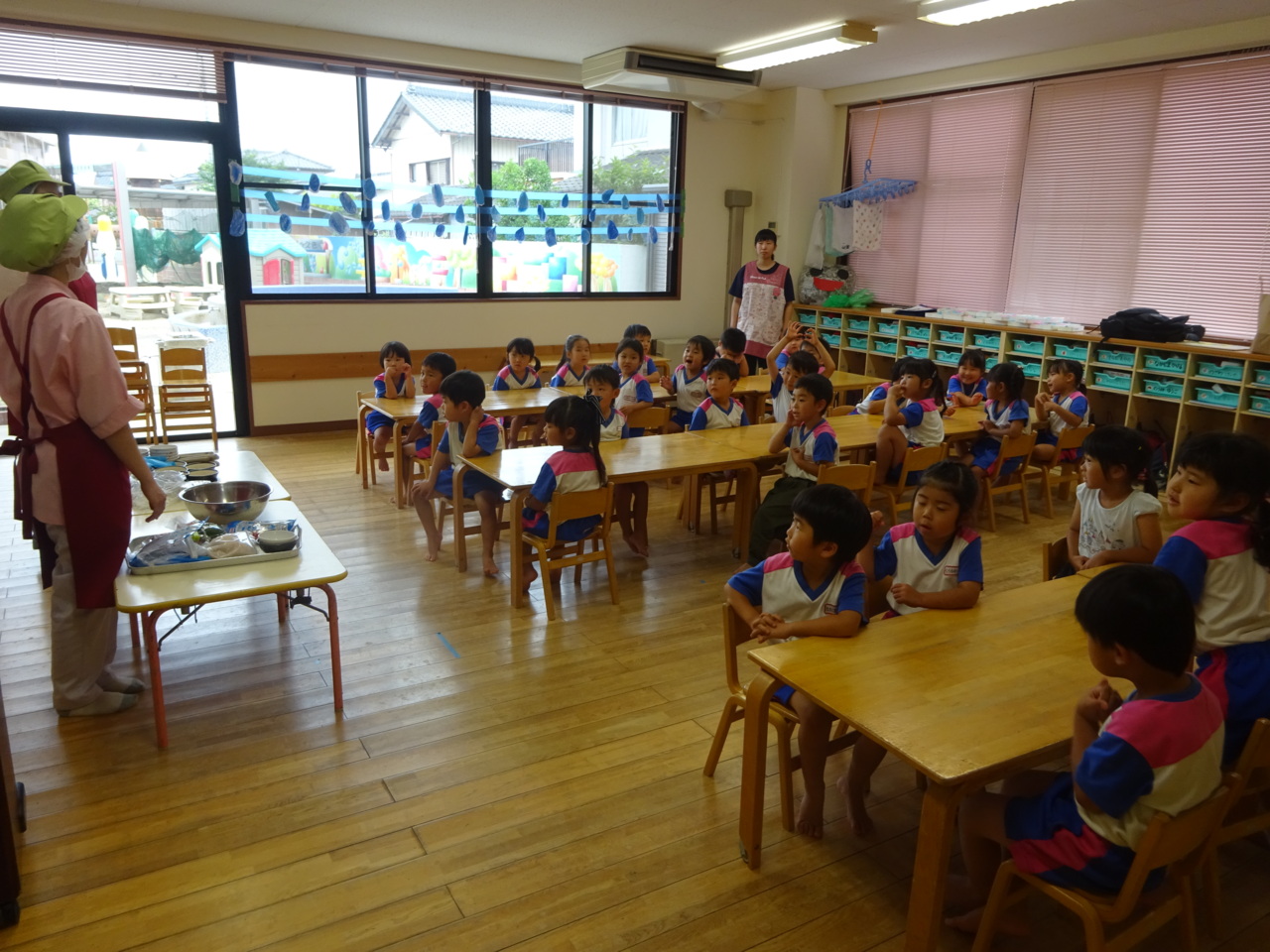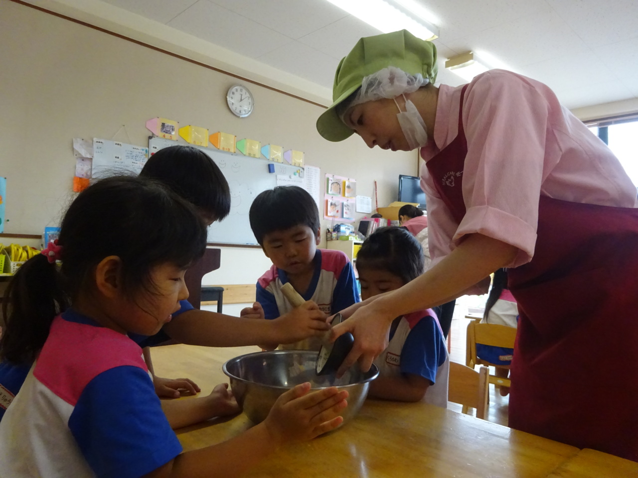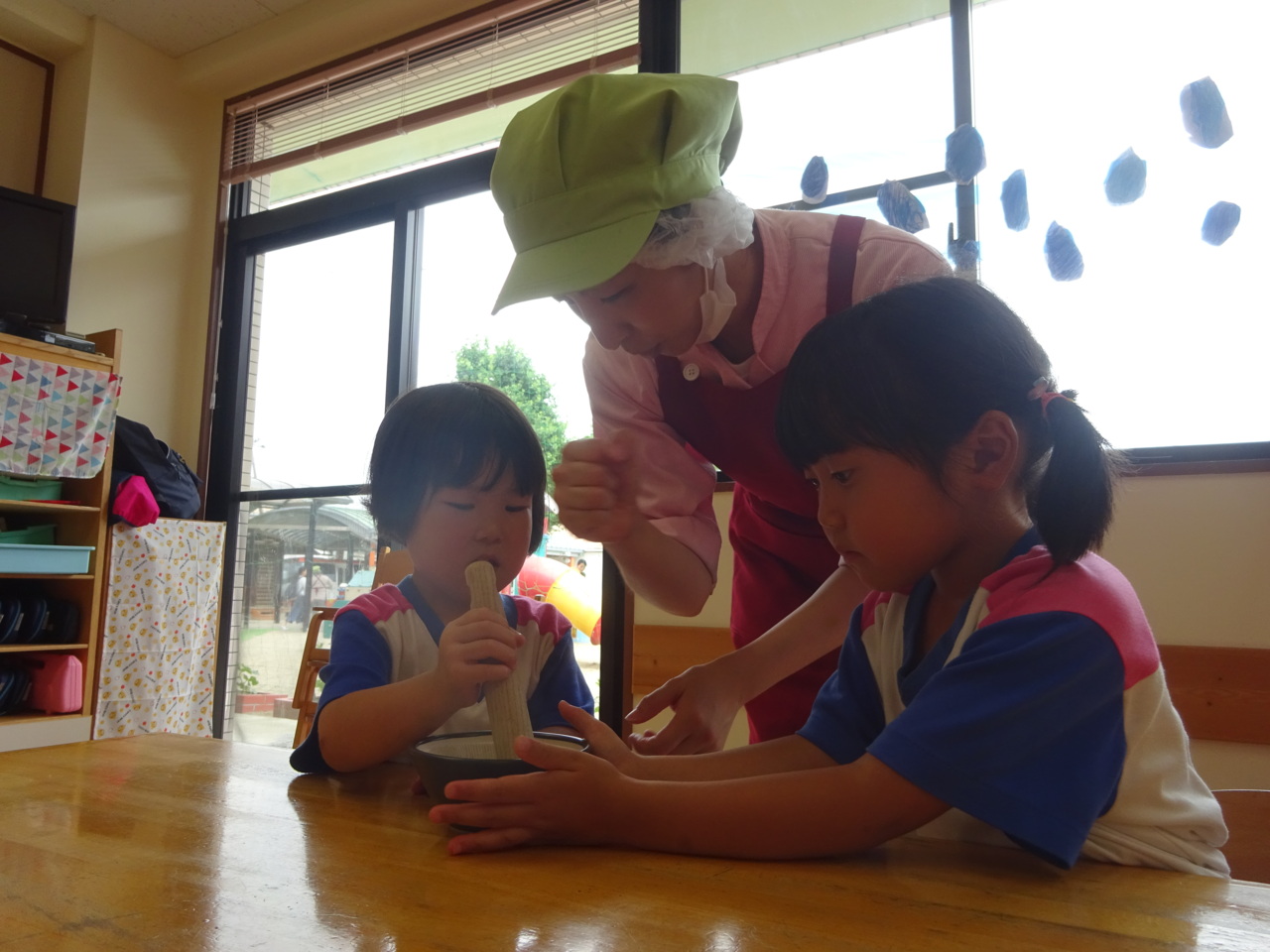 さいとうさんにすり方を教えていただきました♪ お友だちがやっているときは、すり鉢を持っていてあげたりと、優しい姿も見られました(*^_^*)
