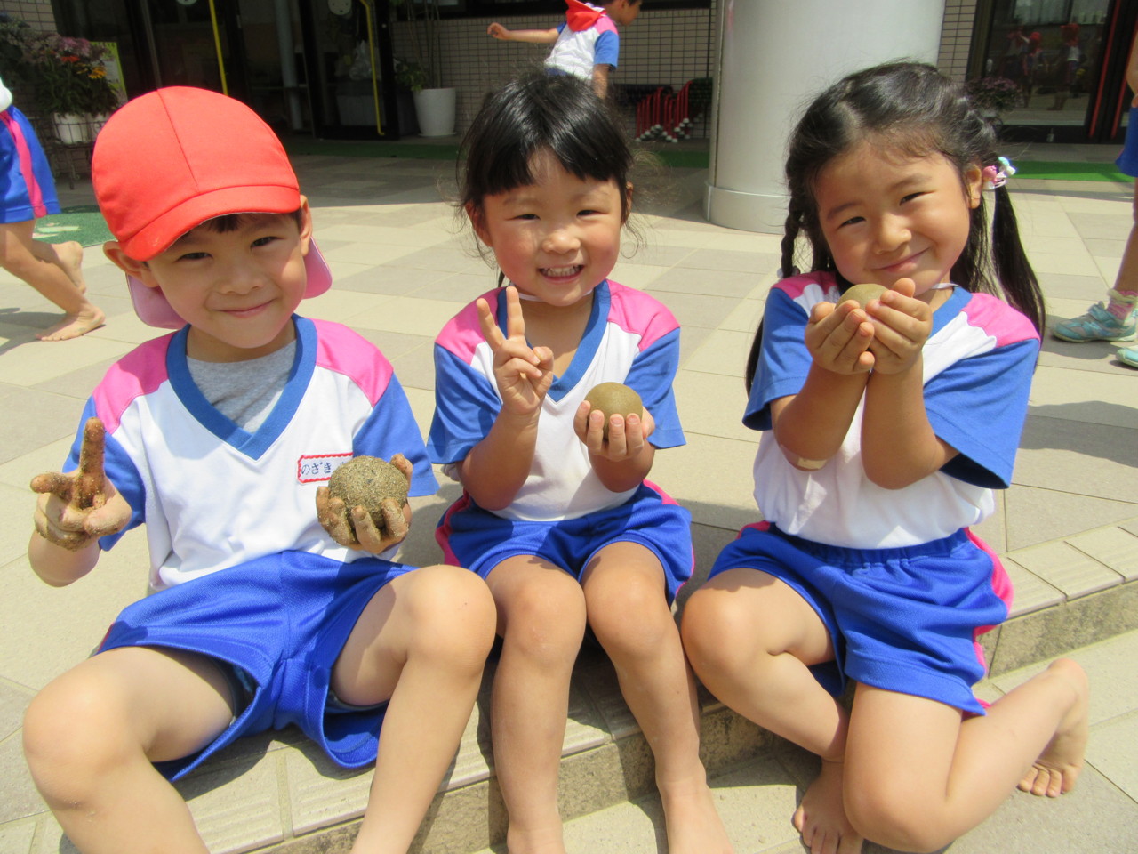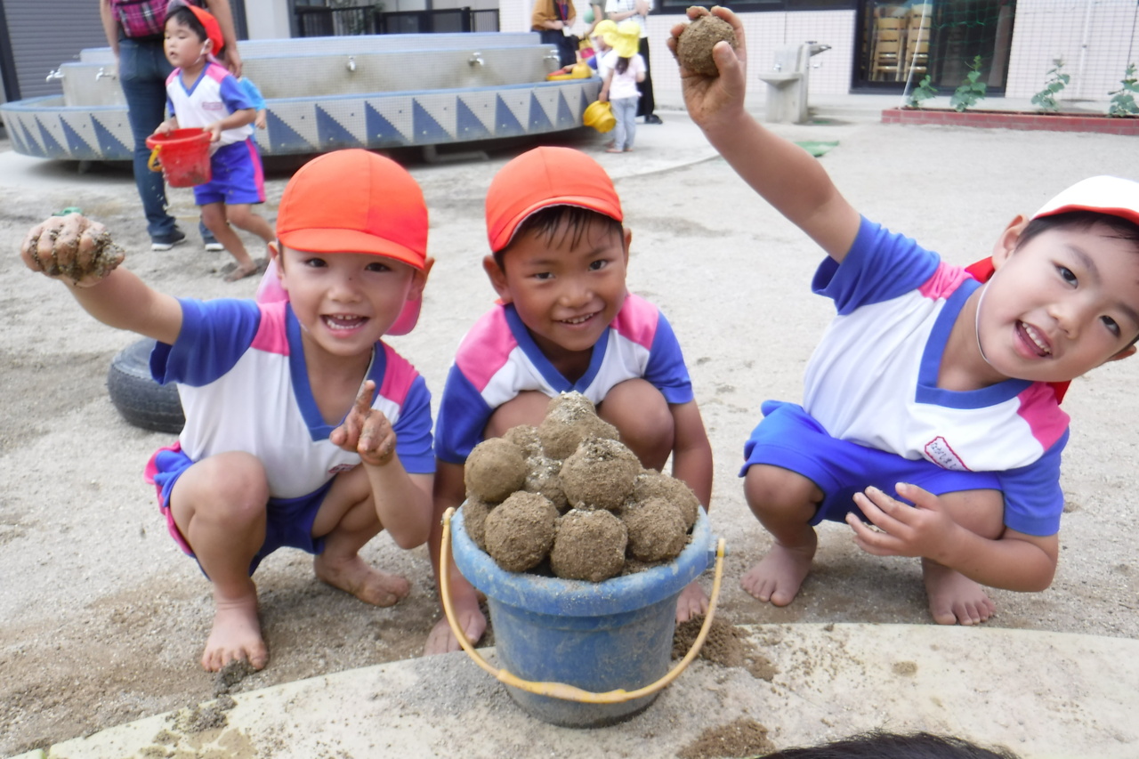 天気のいい日は戸外で元気に遊んでいます♪ 大人気のお団子作り! 「みて!ピッカピカ!」