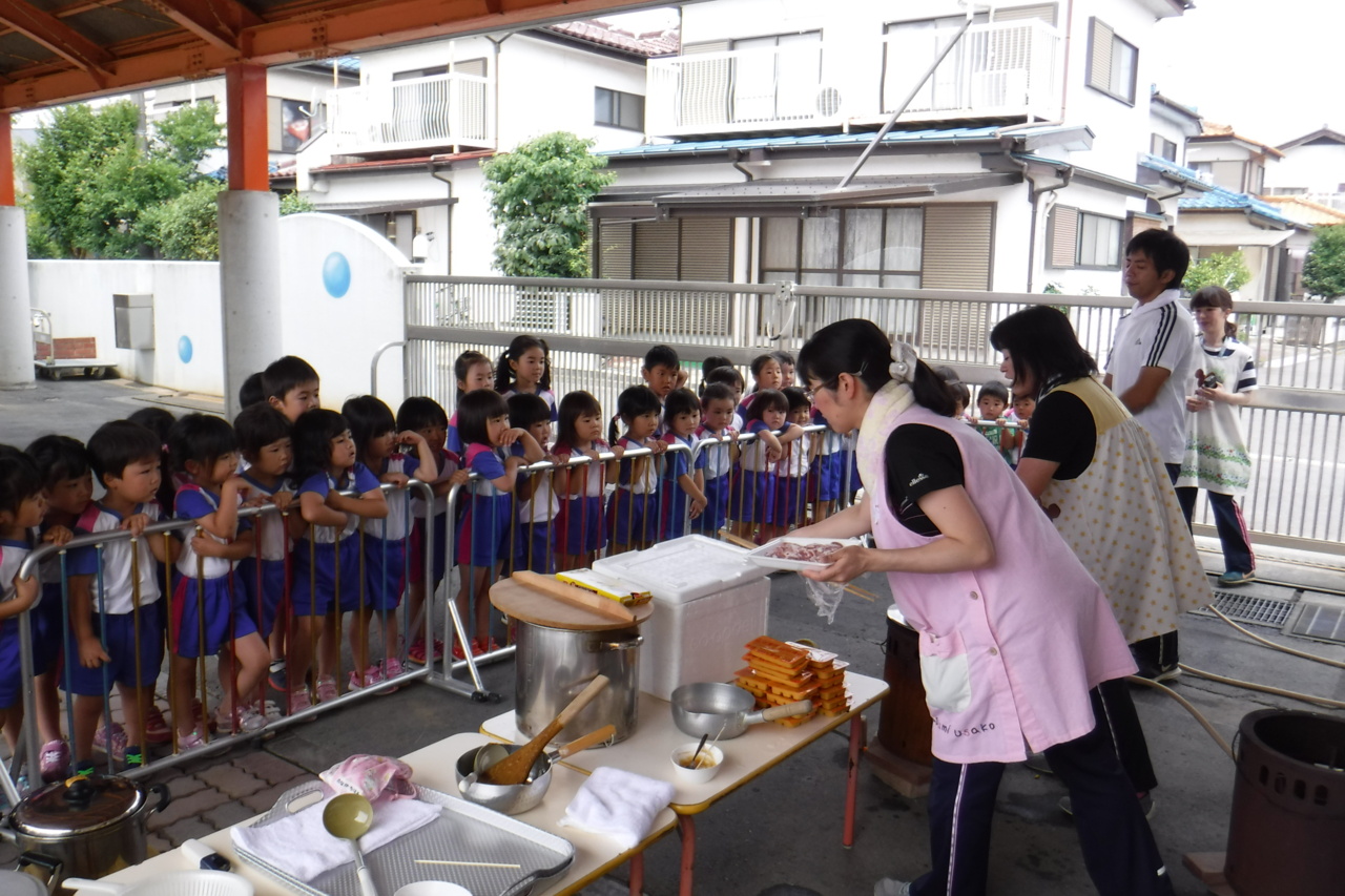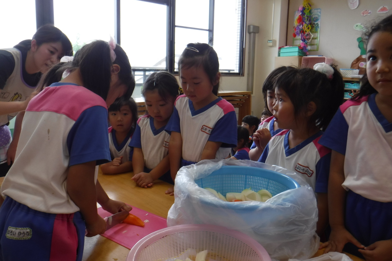 カレーパーティーのお楽しみです! 年長さんの野菜切りを見学しました☆ 「おねえさん、がんばれ!」