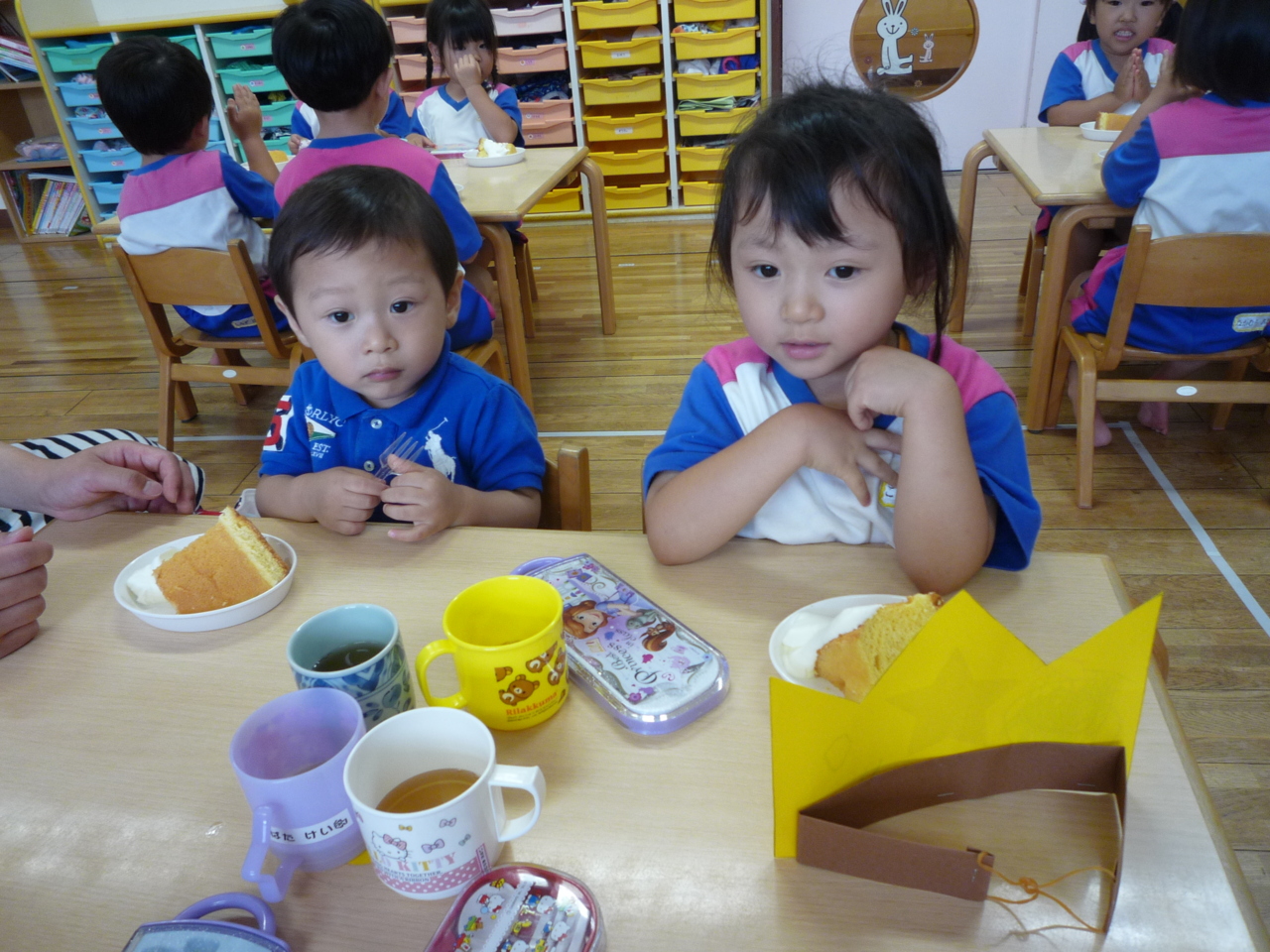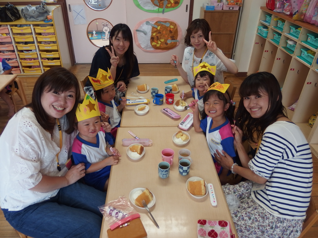 お母さんと一緒にケーキを食べて、とっても楽しそうな子どもたち(^O^) 6・7月生まれのお友だち、お誕生日おめでとう!