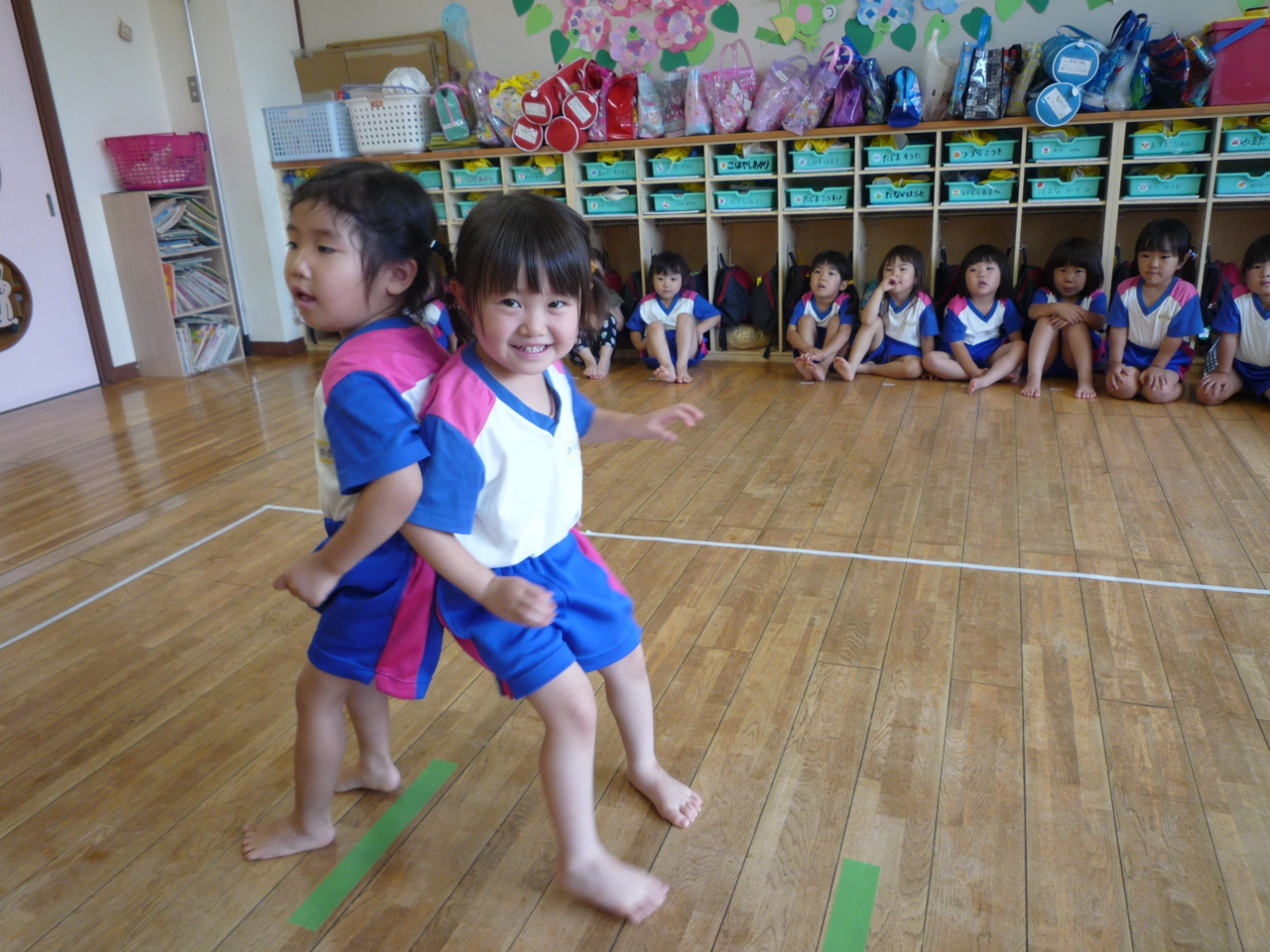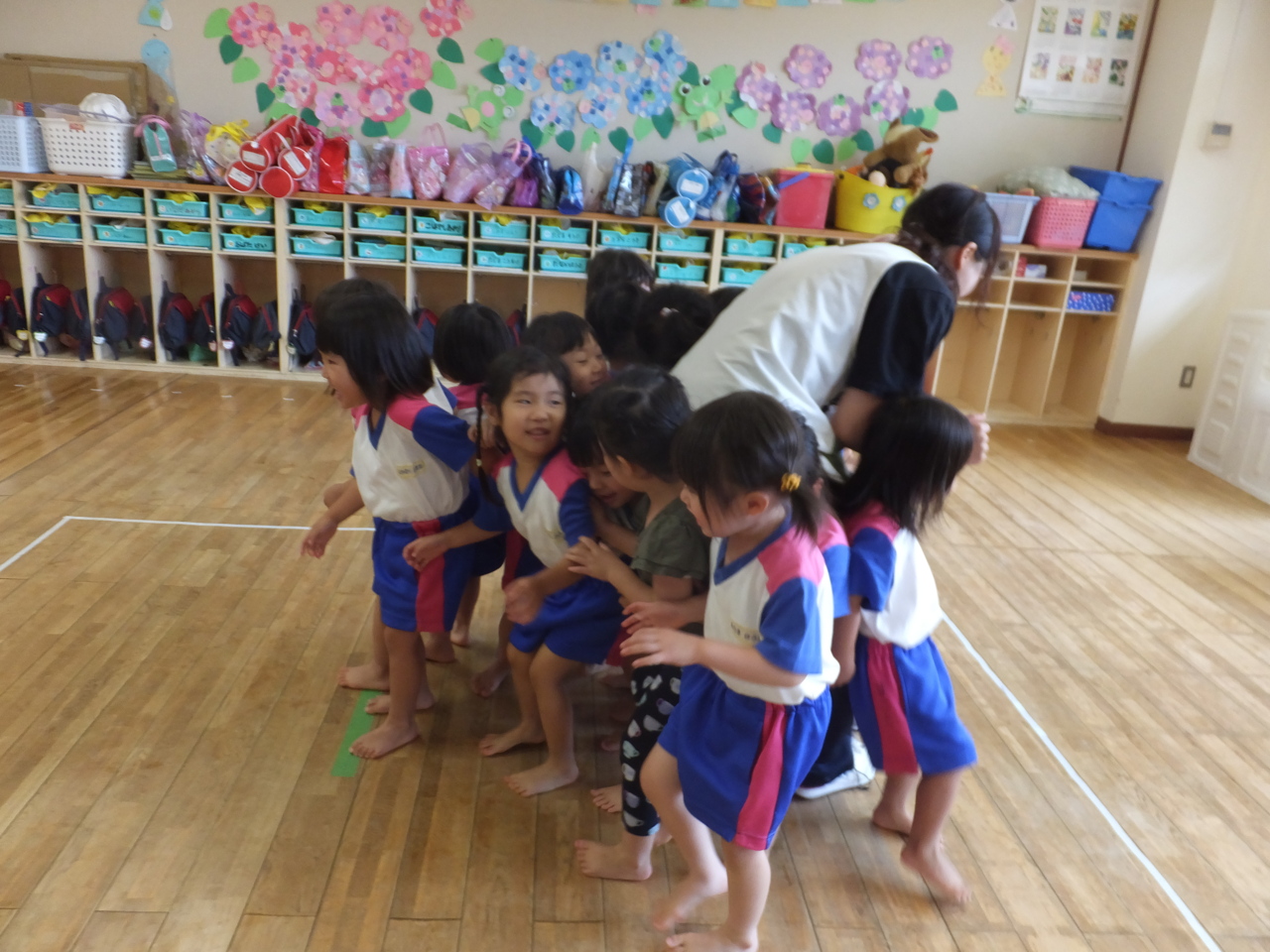 手は使わず、おしりでぐんぐん押しあいっこ☆