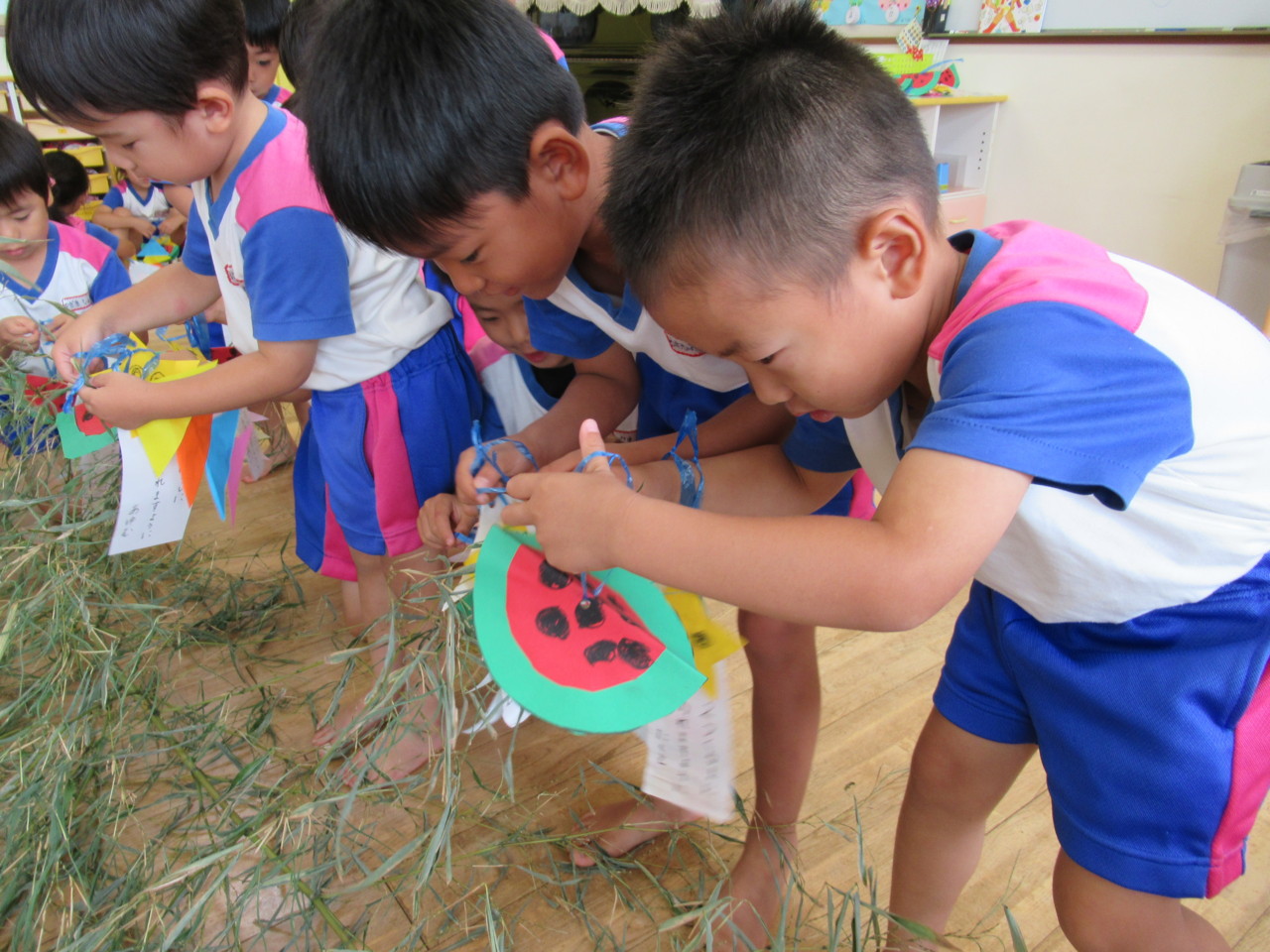 今日は7月7日七夕です! 短冊にお願いごとを書いて、みんなで笹に飾りました♪