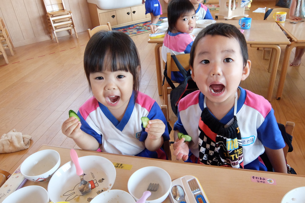幼稚園できゅうりを収穫しました! 塩もみにして、いただきまーす! 嬉しそうに食べていました(*^_^*)