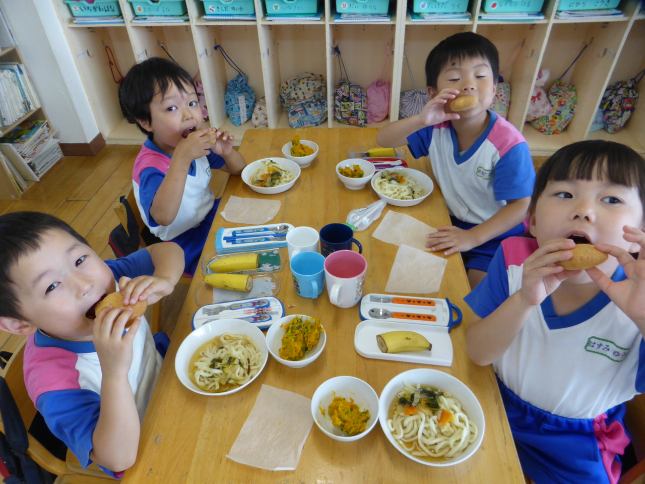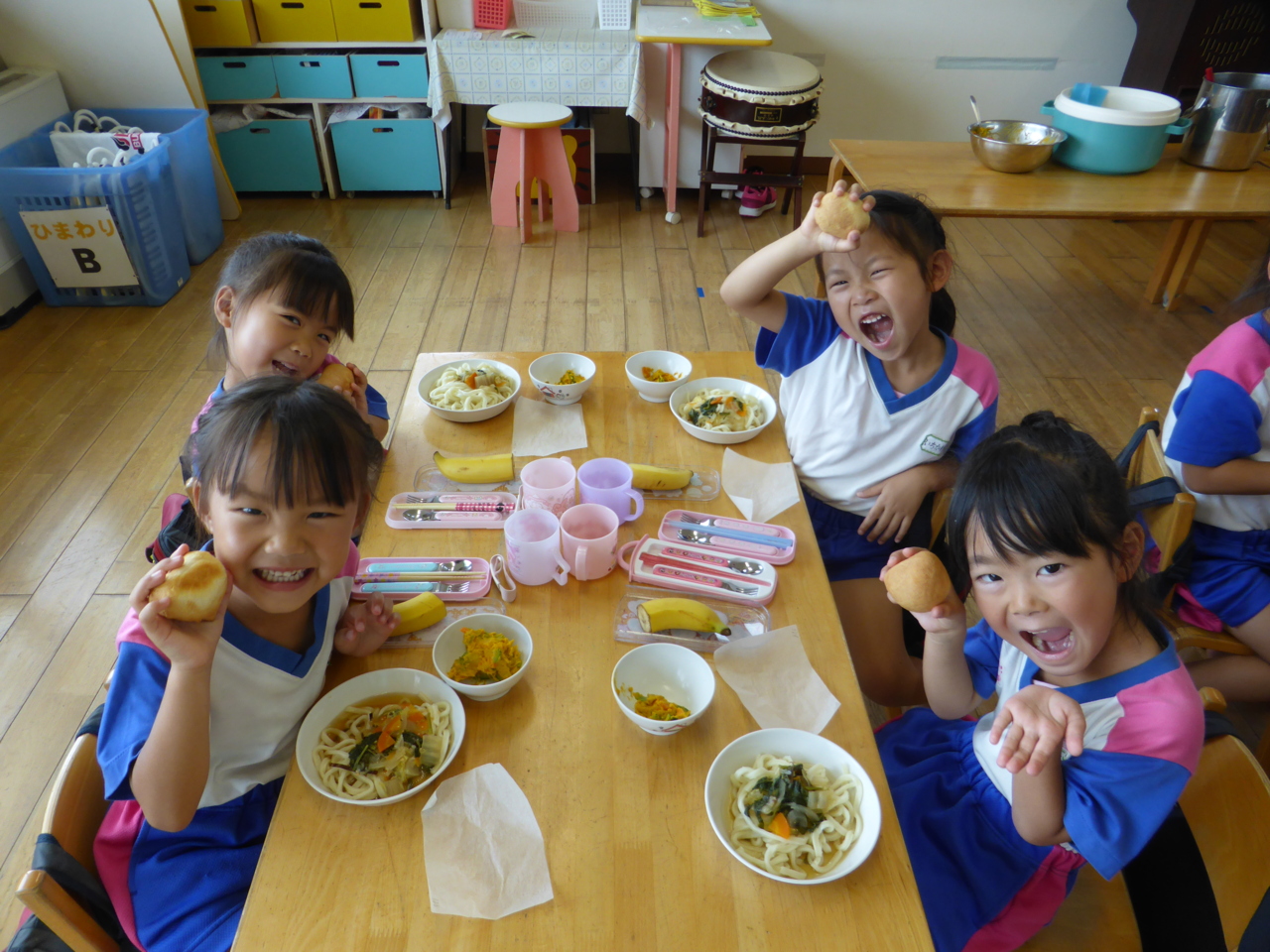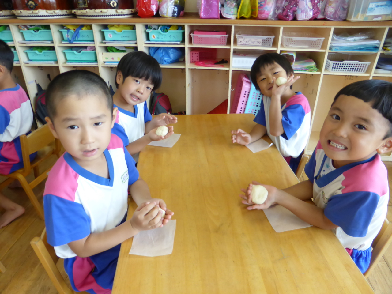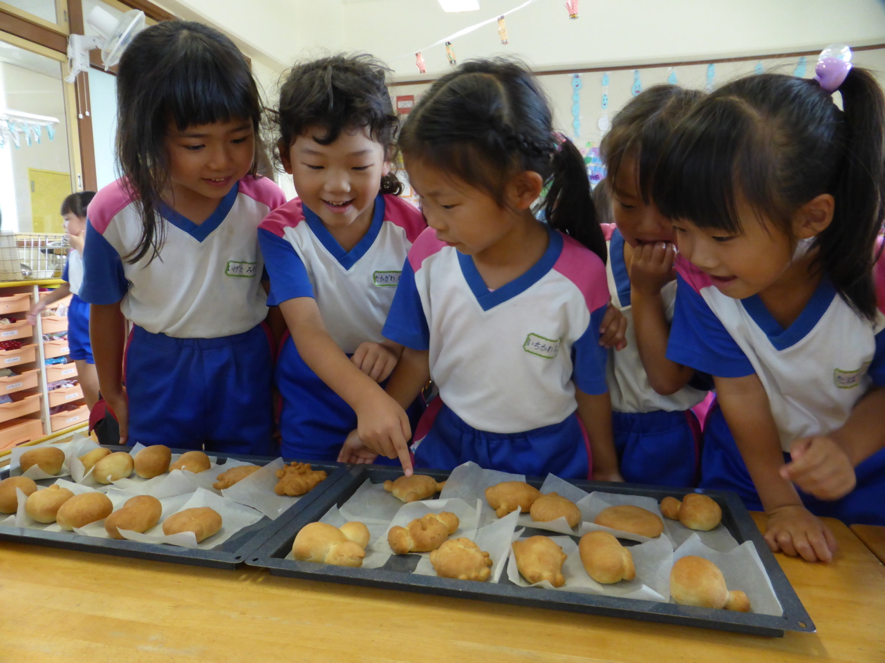 「おいしそう~!!」 「わたしがつくったのこれ!!」 できたパンに大喜びのひまわり組さん(^O^)