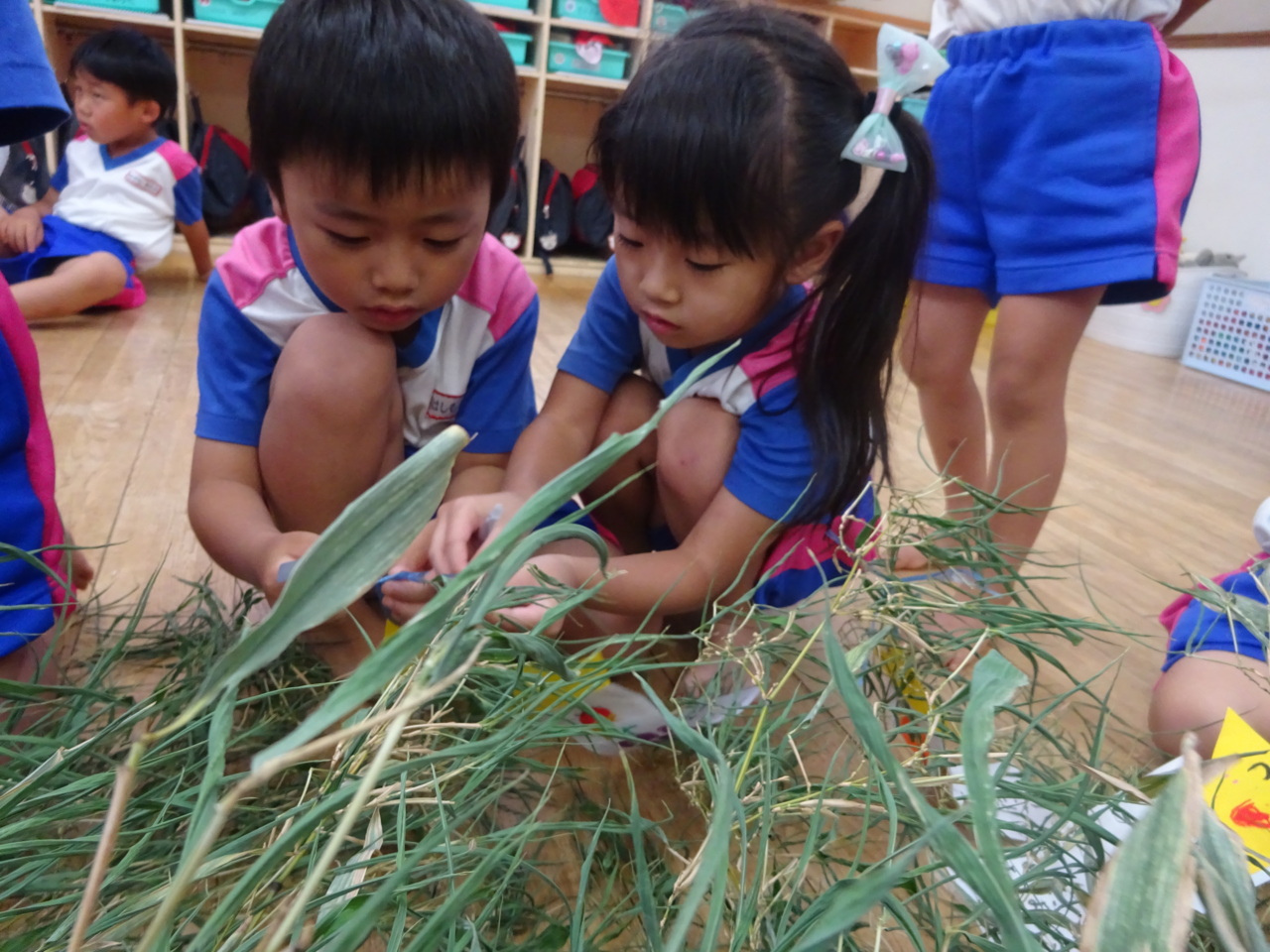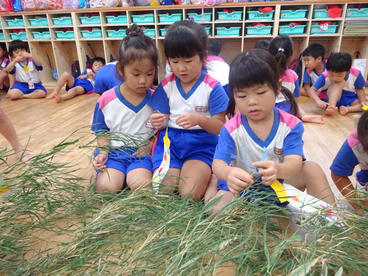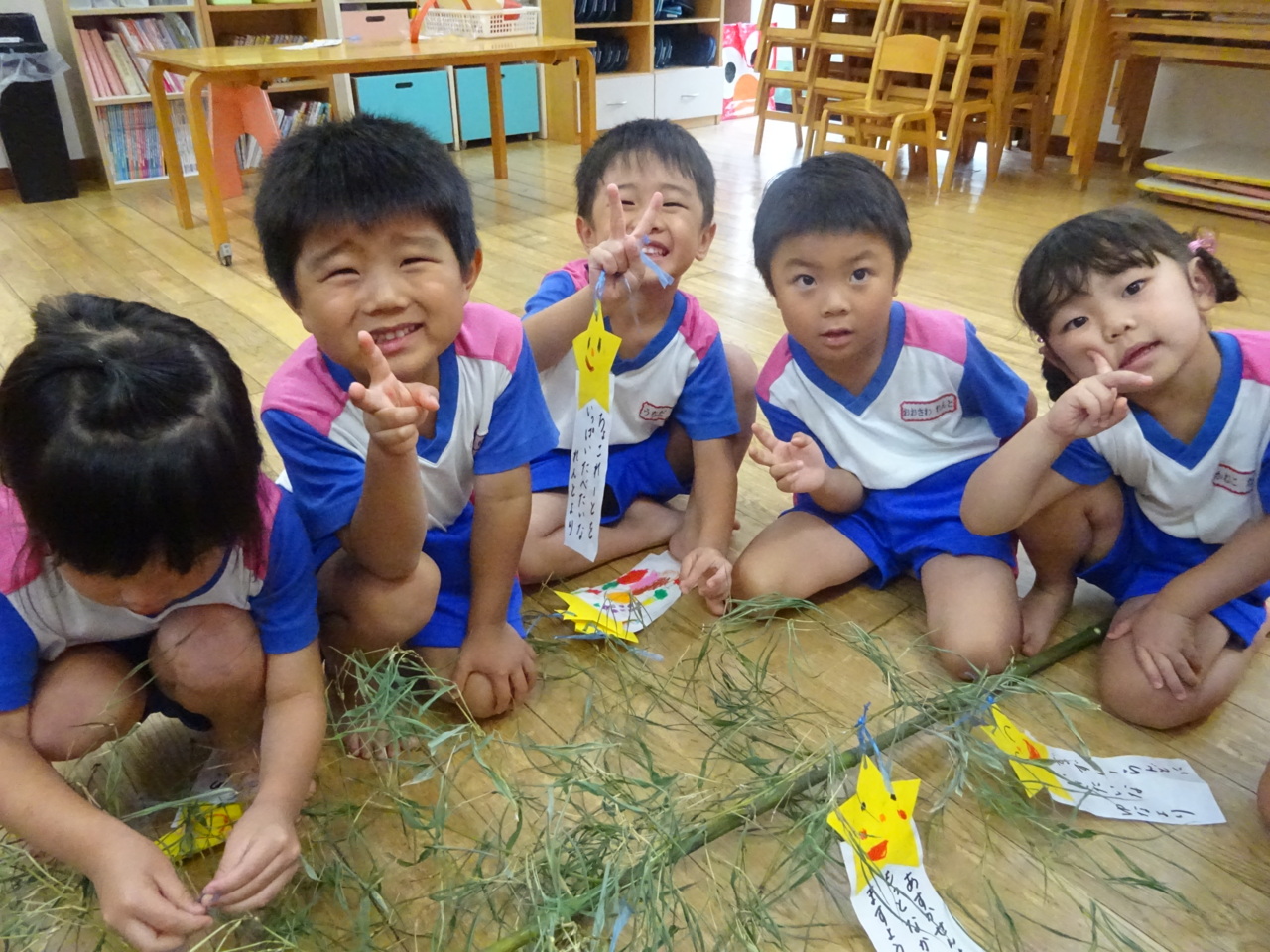 七夕に向けて、笹に飾りつけをしている様子です!