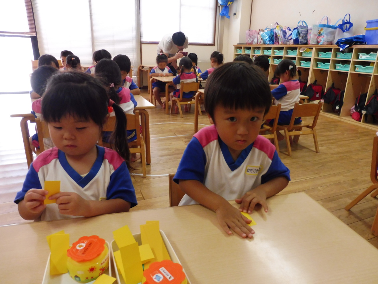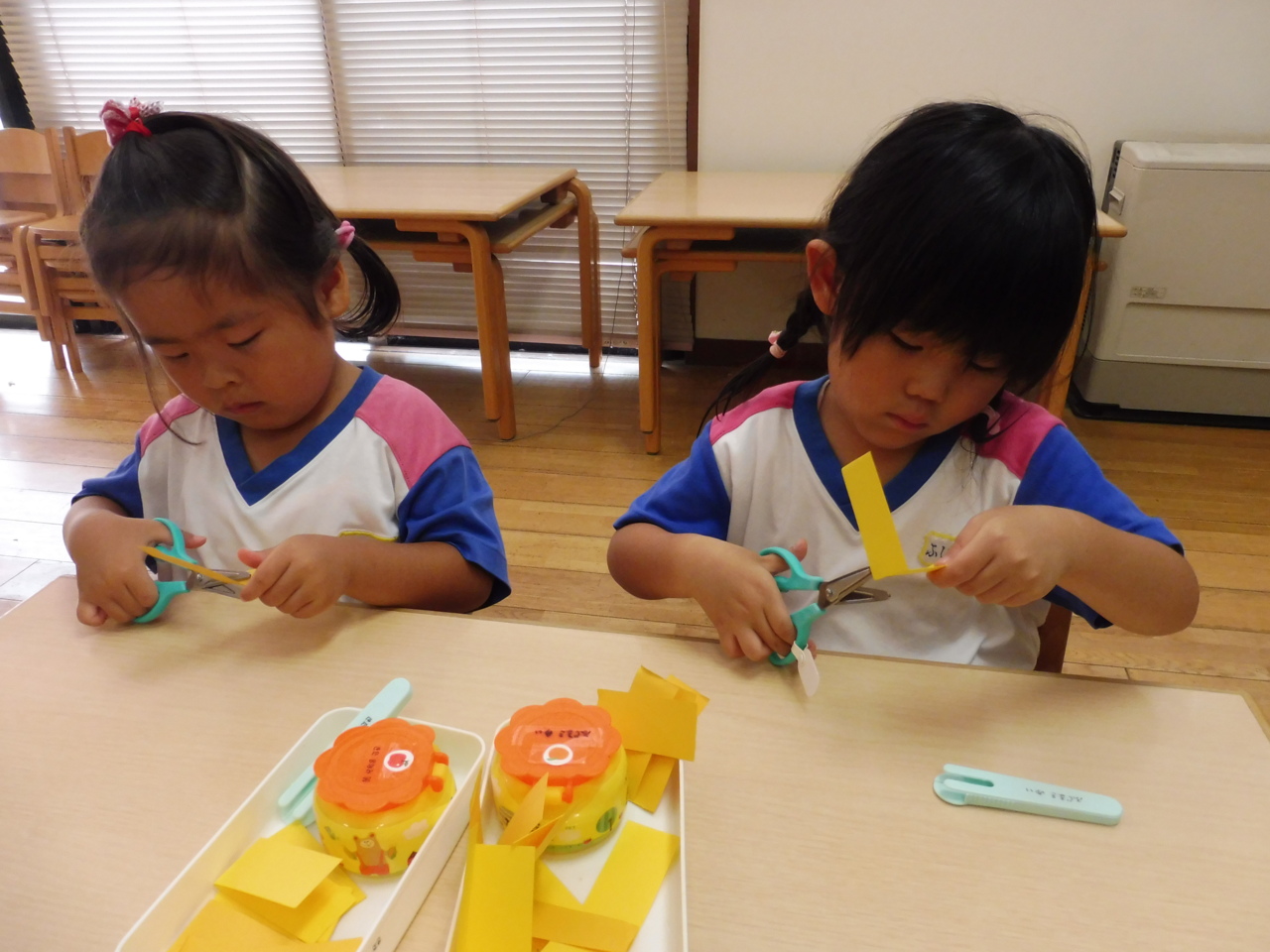 ひまわり製作☆ まずは、花びら作りからスタート! 長い紙を半分に折っていきます。 「はんぶんこ♪はんぶんこ♪」