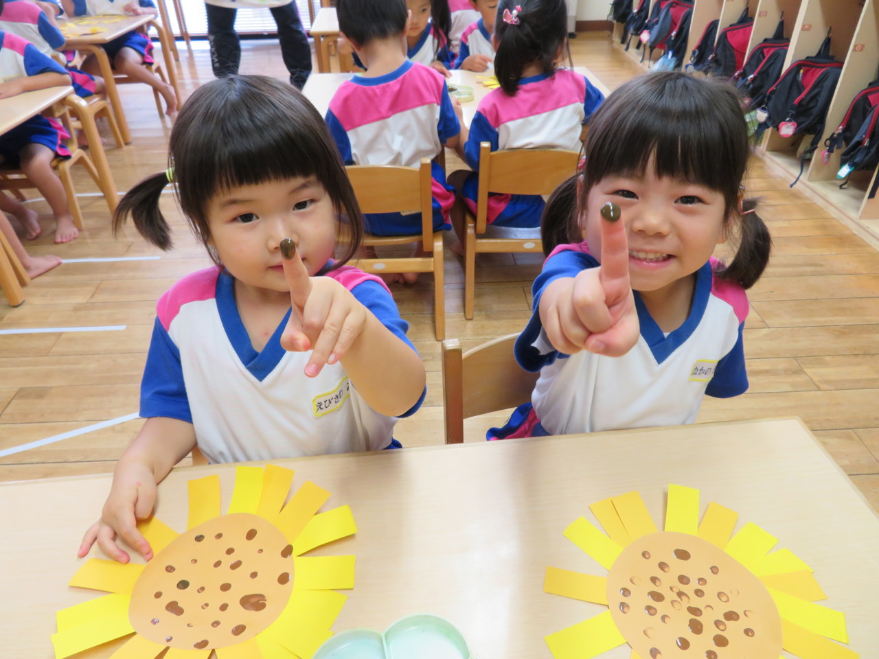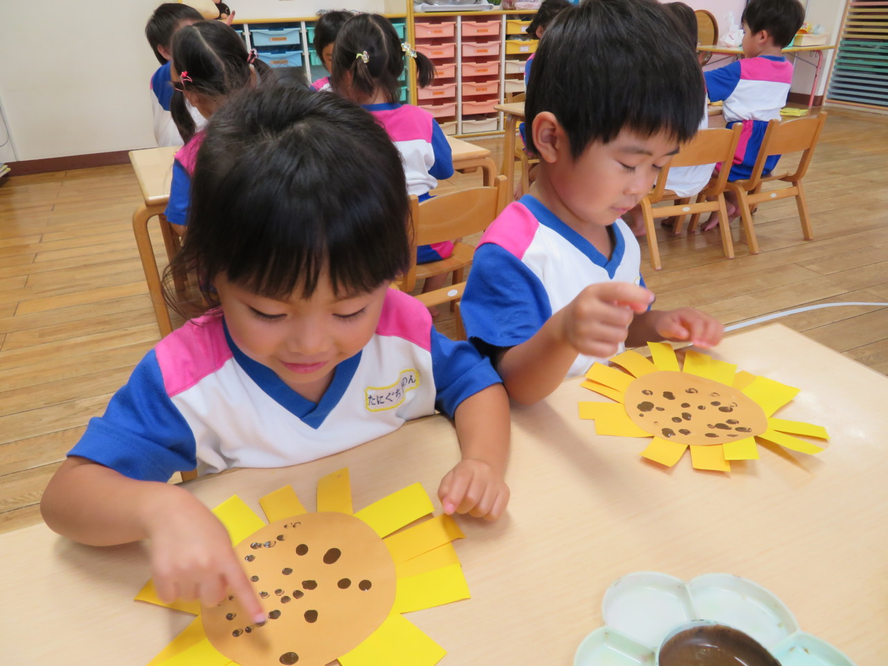 仕上げは、指絵の具で種を作ります。 「みてみて~!」