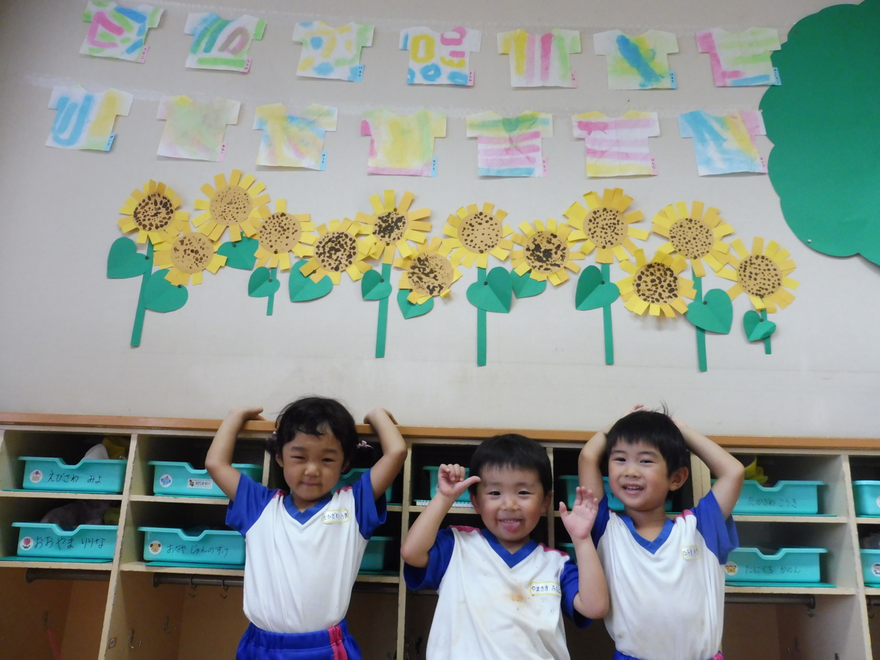 さくら組にひまわりがたくさん咲きました\(^^)/ にじみ絵で作ったTシャツも♪ きれいですね~(o^^o)