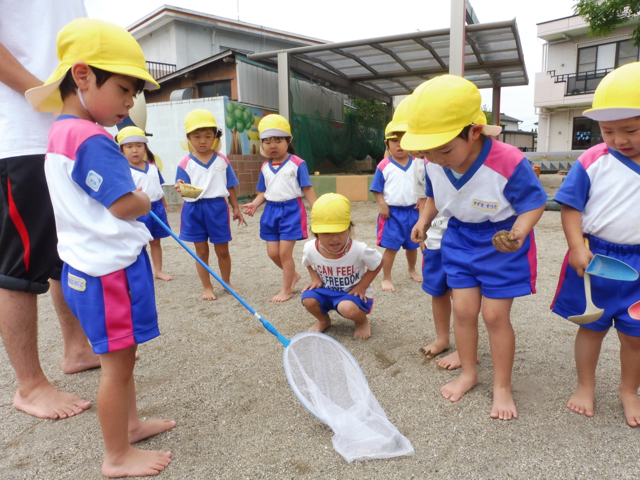 セミを見つけました! ちょっぴりドキドキしながらも興味津々の子どもたちです。 夏の自然に触れながら、8月も元気に過ごしましょうね(^^)