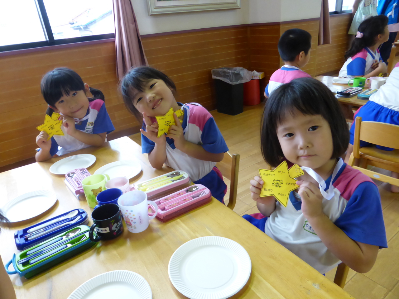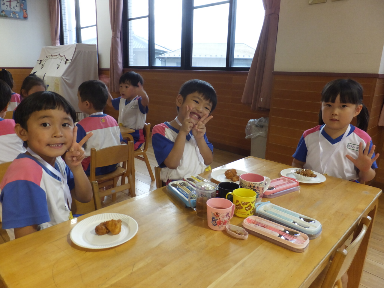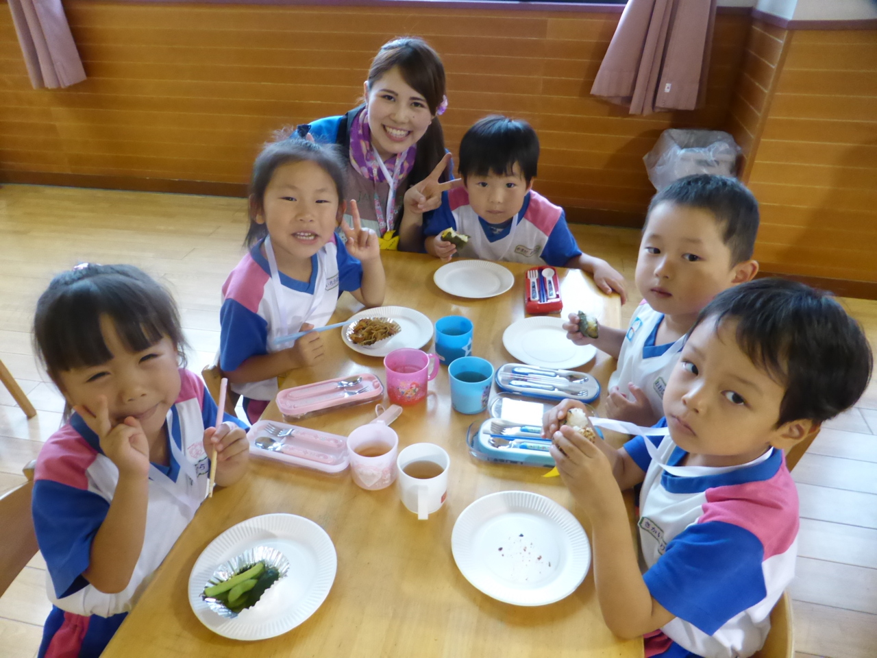 作ってくれた先生といっしょに 「はい、チーズ」 おかわりもたくさん食べました。