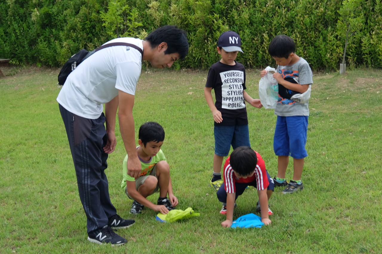 虫愛好会の5人は、早速虫探し。 網なくたって大丈夫!(^^)! 帽子を使って「GET!」 大切に虫を持って帰ってきました。
