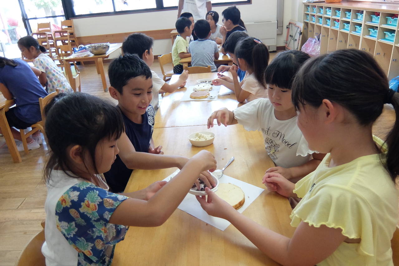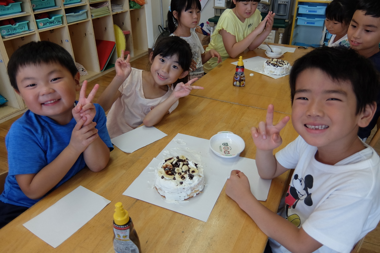 お誕生日会のケーキ作りにみんなで挑戦!! 今回は、6つのグループに分かれて作りました。 みんなで、クリームやバナナなどのトッピングを考えながら楽しく作れましたね(^^♪