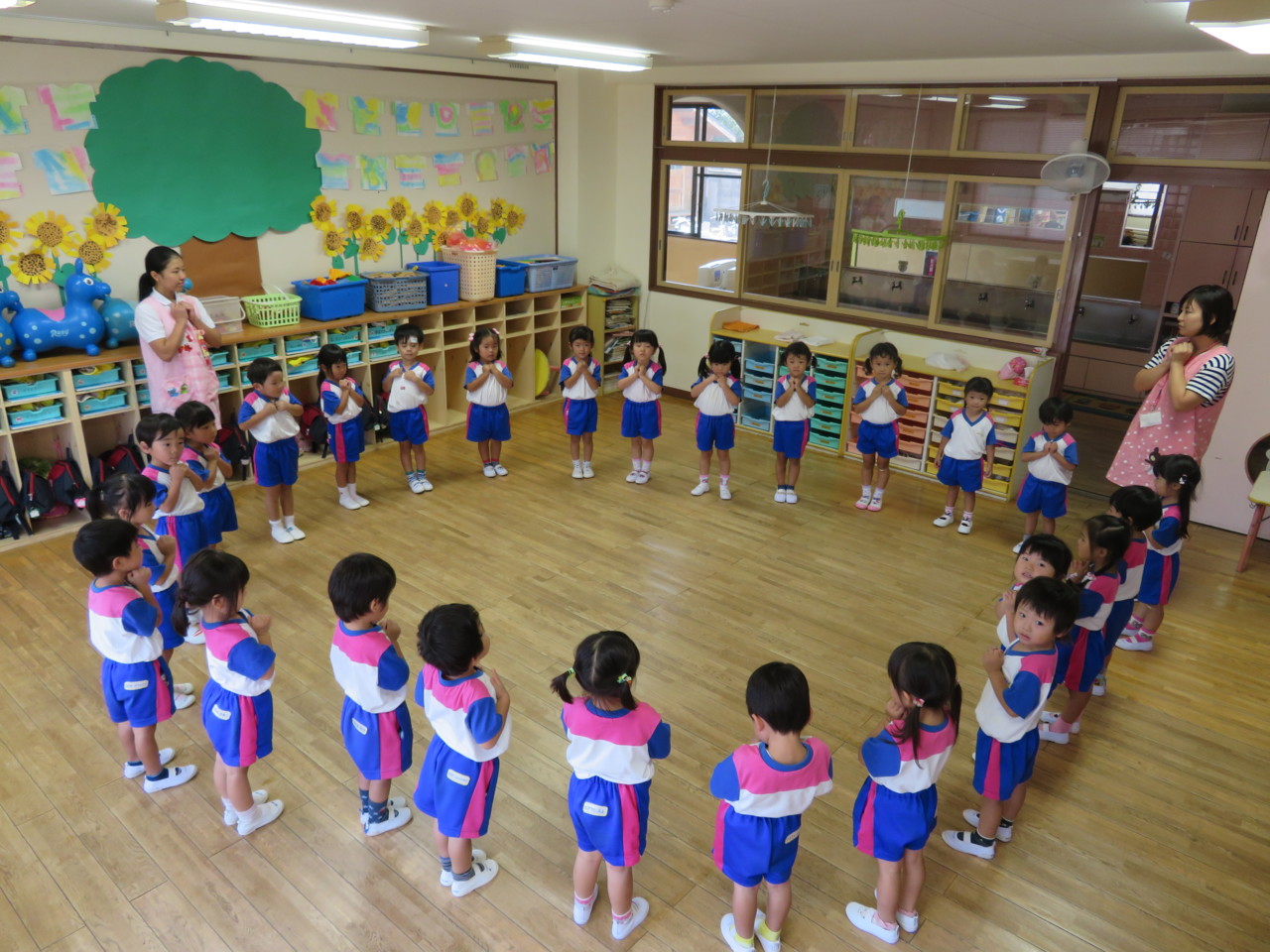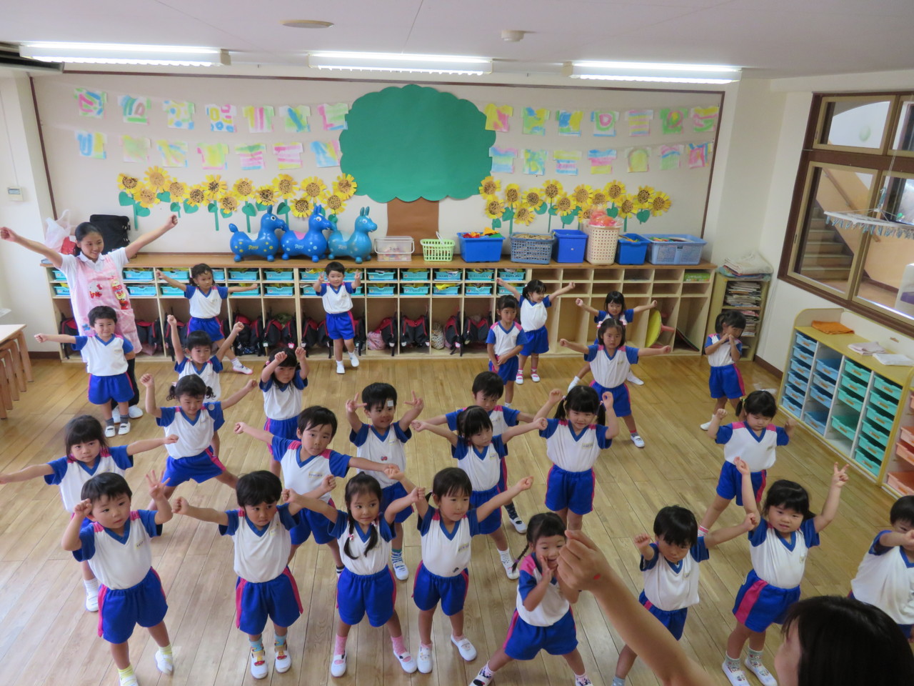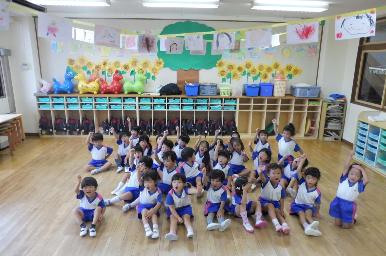 お遊戯は、大きな円になって踊ります。 少しずつ、きれいな丸が作れるようになってきました\(^o^)/ エビカニクスは、みんな大好き(*^^)v