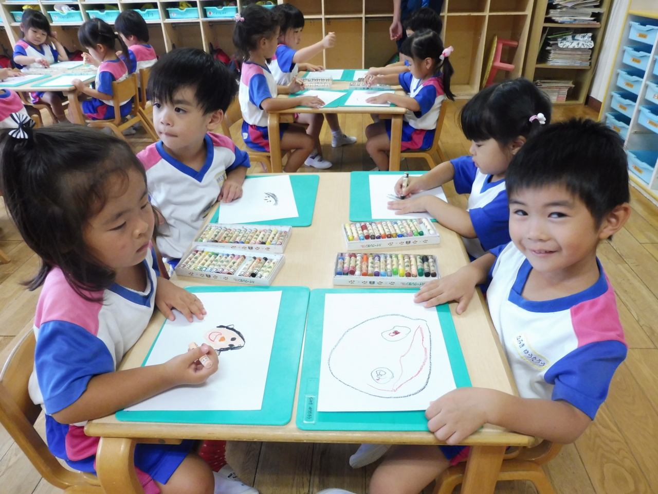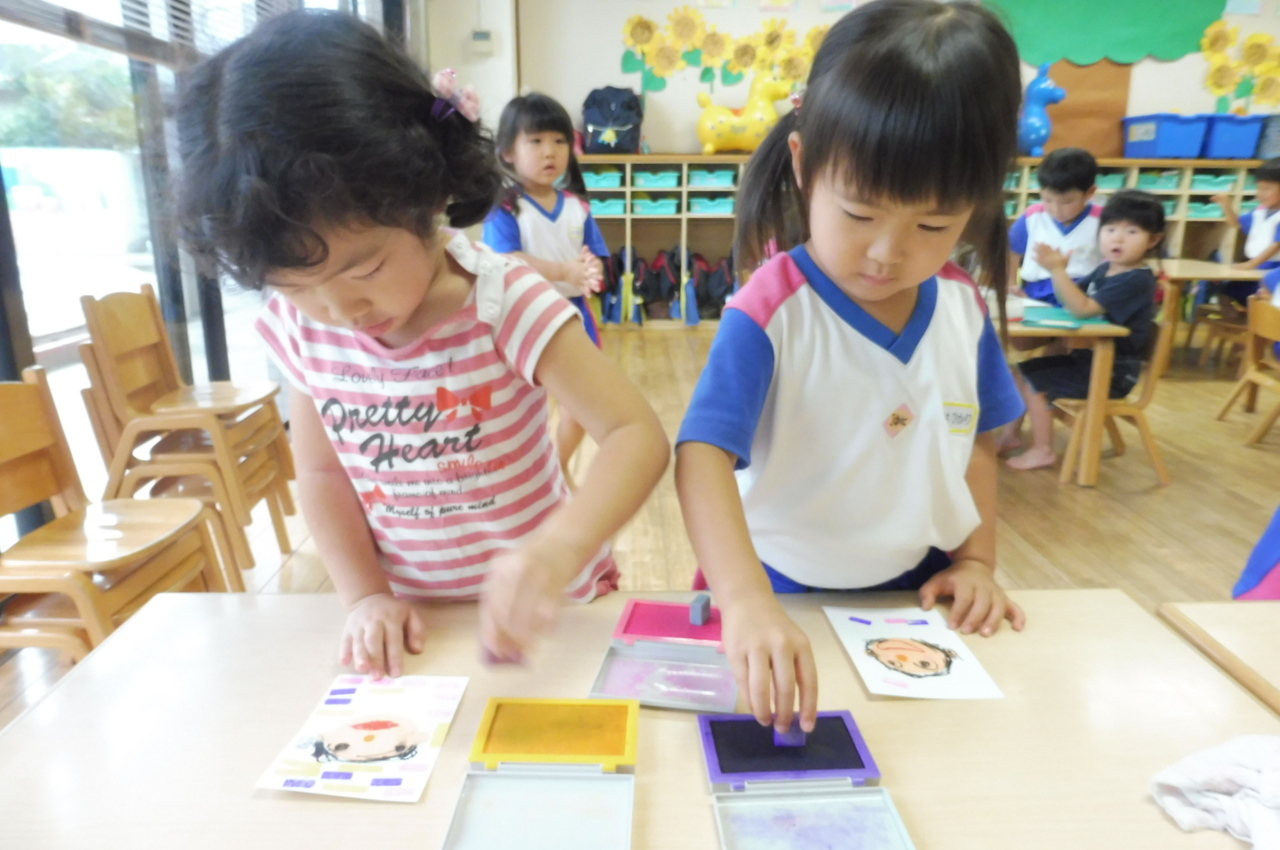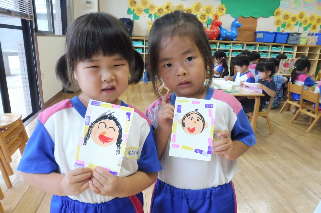 ☆敬老の日のハガキ書き☆ 自分のお顔を描きました!まわりには、かわいいスタンプ♪ 「ぺったんぺったん!」