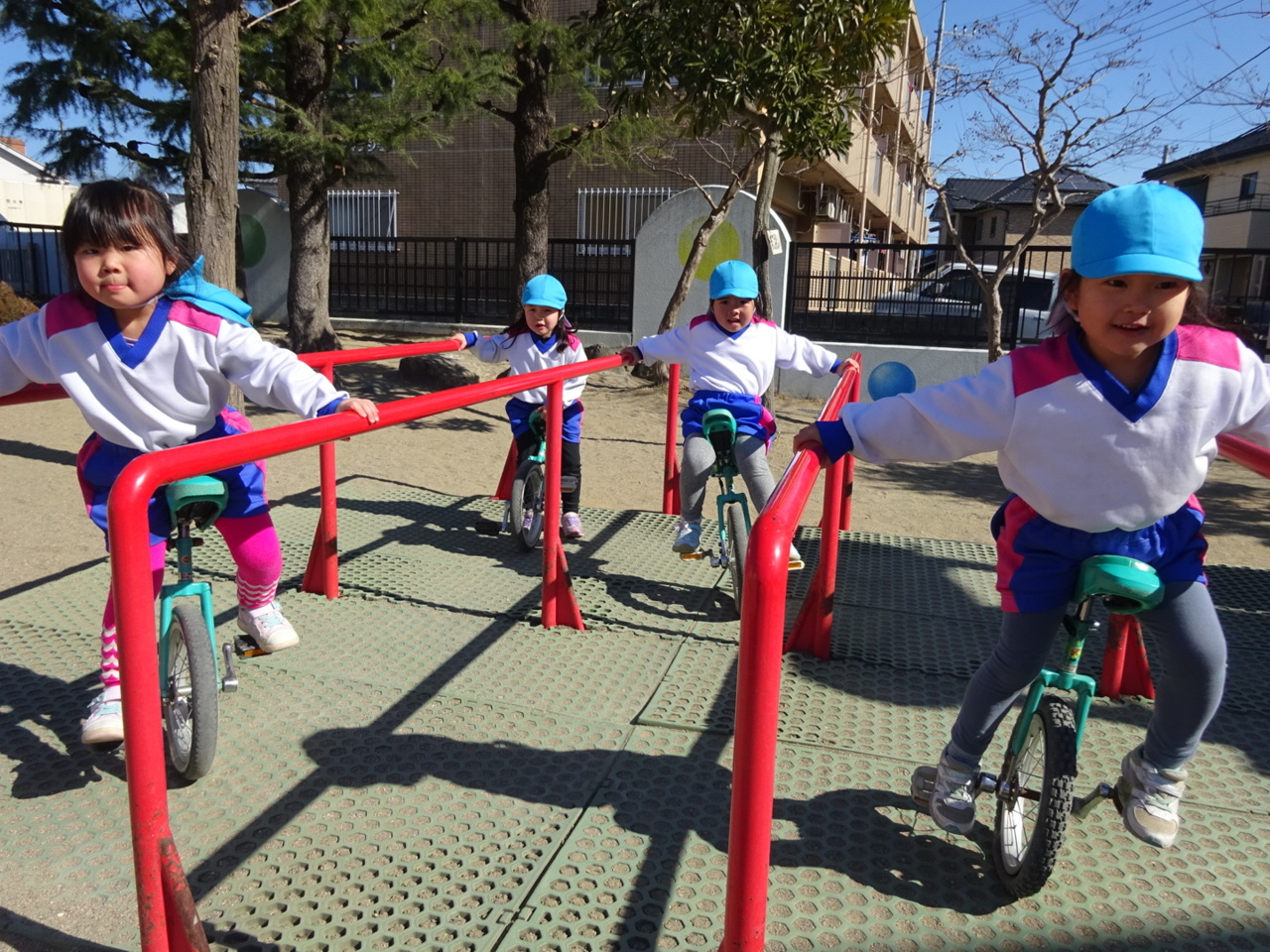 一輪車にチャレンジ!!! 年長さんみたいになれるように、練習中です。 手すりにつかまって、よいしょ、よいしょ!