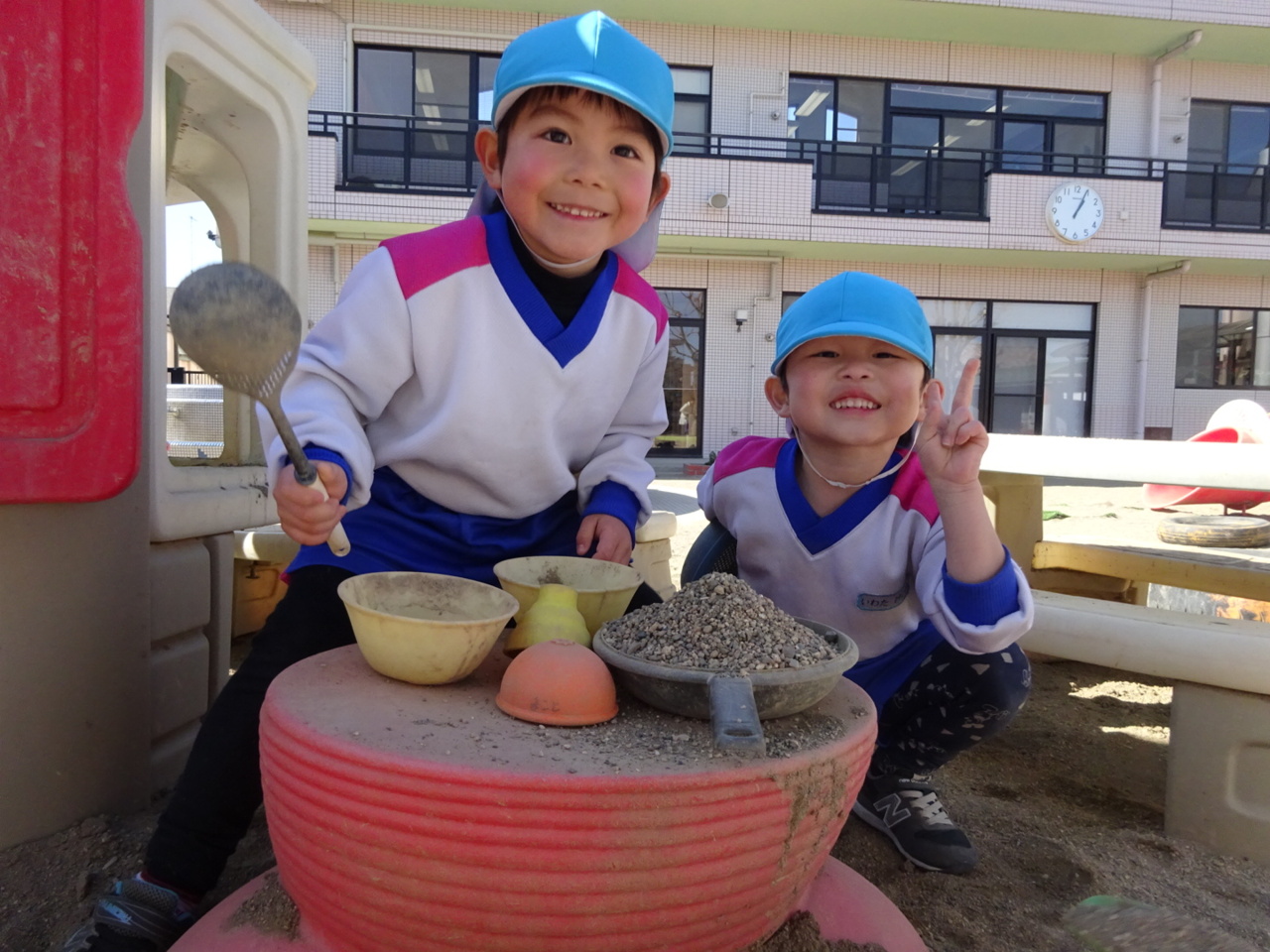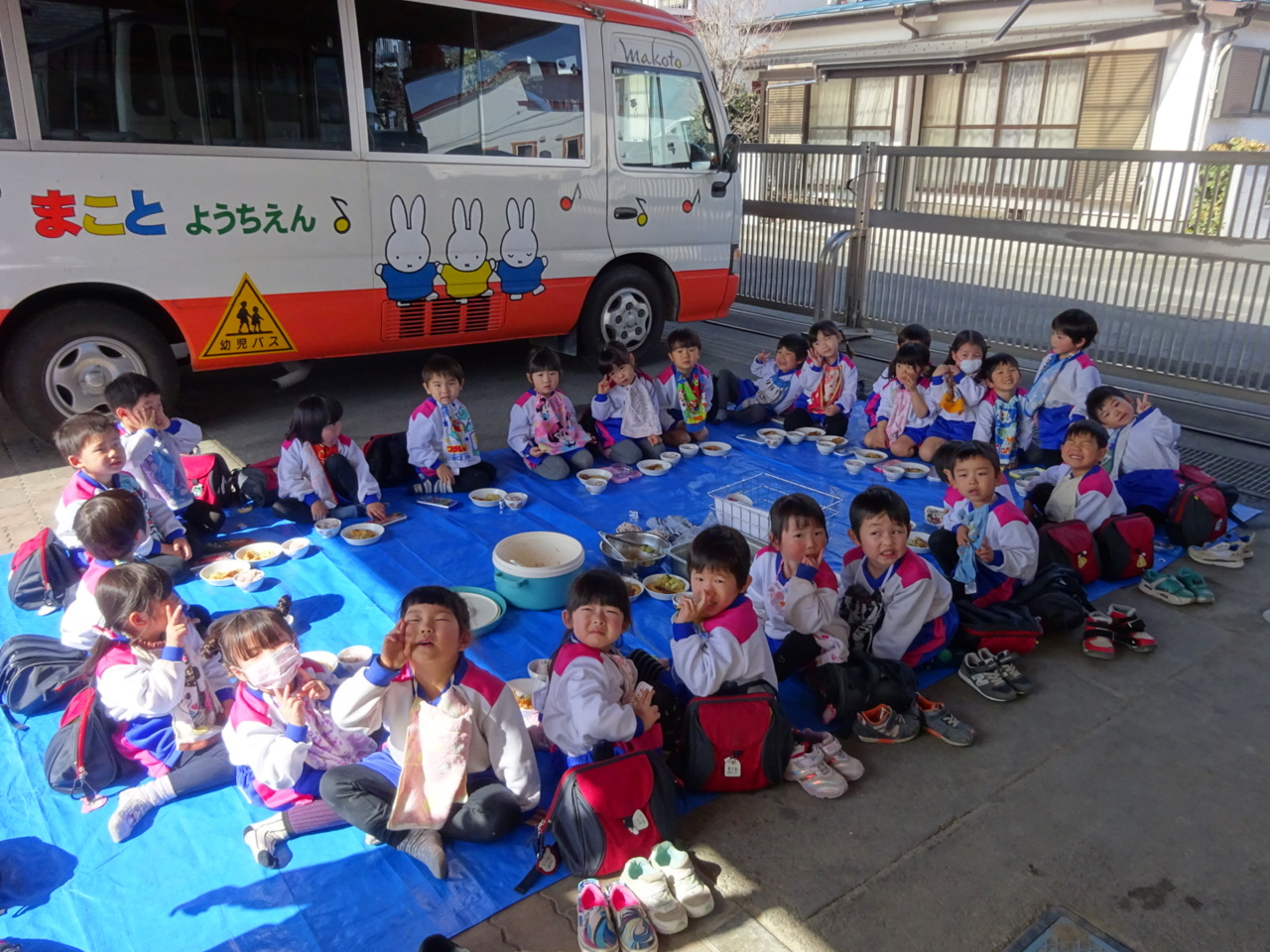 先日の春のような暖かい日に、お外でお昼を食べました。 「お外で食べたい!!」という子どもたちからのリクエストでした。いつも以上に給食をモリモリ食べて、午後も戸外でたくさん遊びました!