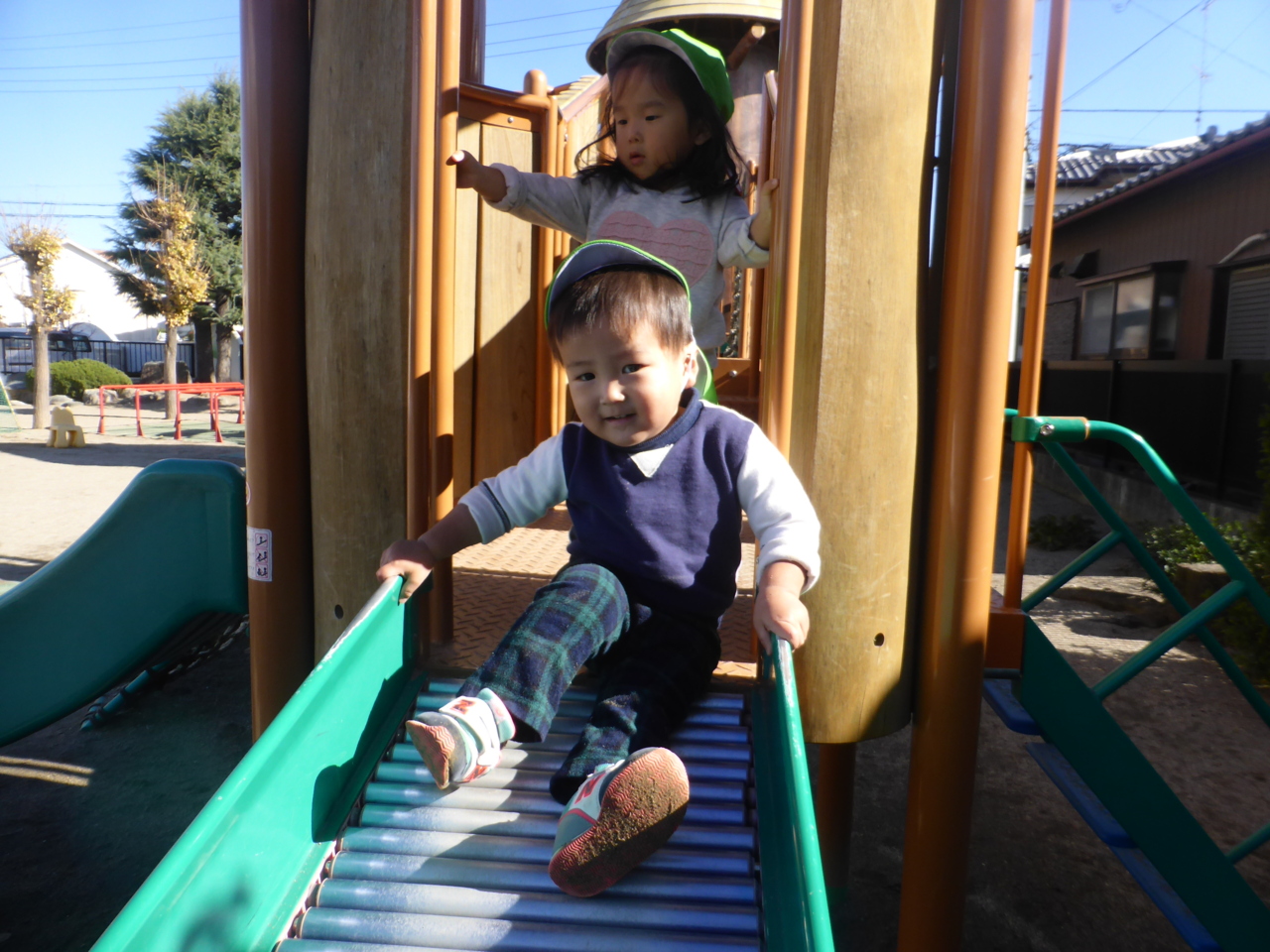 今日もとっても良い天気♪ 自分で靴を用意できるようになりました。 順番に滑り台☆彡しゅーっ!