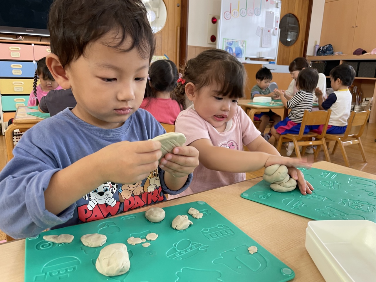 粘土で遊びました! 手を使って、小さくしたり、重ねたり…