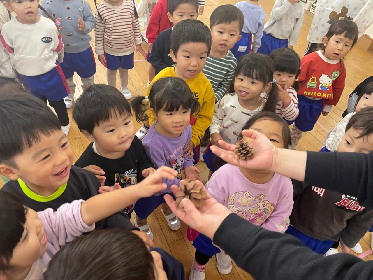 まつぼっくりに興味津々! 触った後、まつぼっくりの歌を歌いました♪