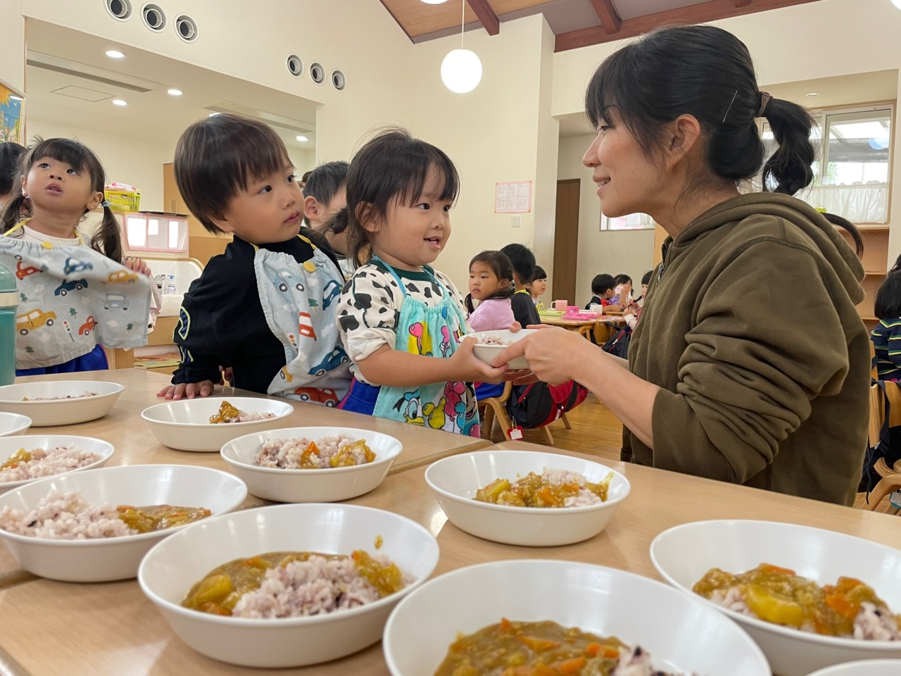 給食でカレーの日は、みんな嬉しい日です♪ いいにおいのカレー。こぼさないように上手に運びます。