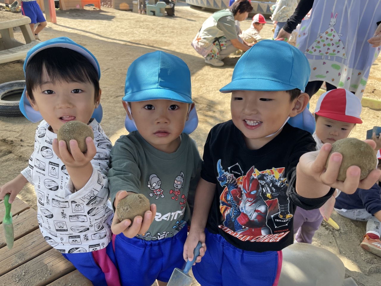 おだんごを手に持って嬉しそうです♪ だんご3兄弟の歌を近くの先生が歌ってくれました♪