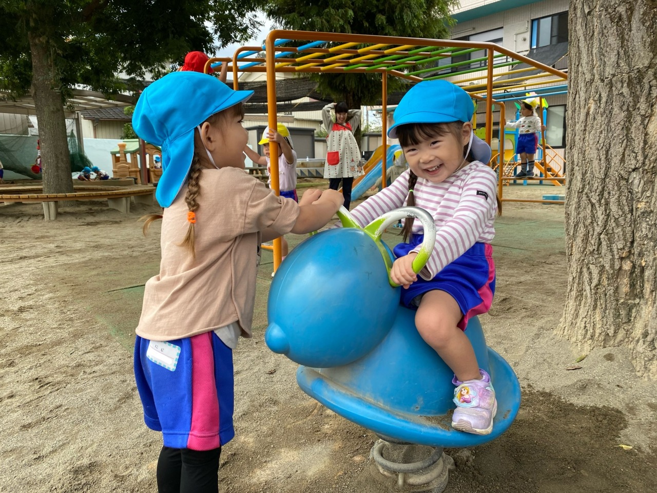 戸外遊びの様子です。 お友だちと一緒にこの笑顔です(^O^)