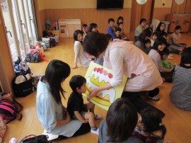大きな紙芝居に「おおきく おおきく おおきくなあれ」と魔法をかけたら・・・ あら!びっくり!!こんな大きなケーキになりました(^O^)みんなでパクリ! 次回のお誕生日会もお楽しみに♪