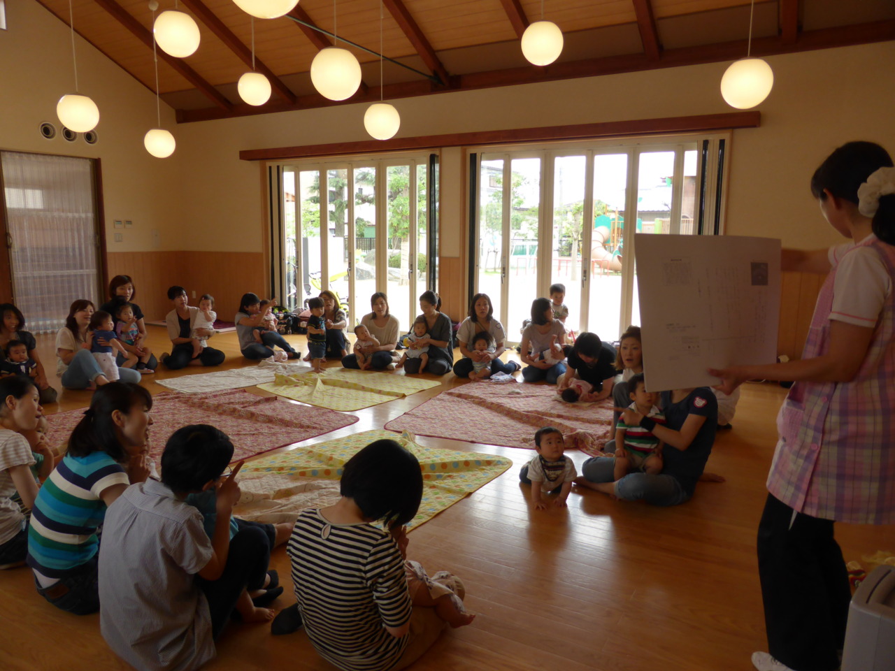 親子で輪になり手遊びをした後、大きな大きな紙芝居が登場すると、