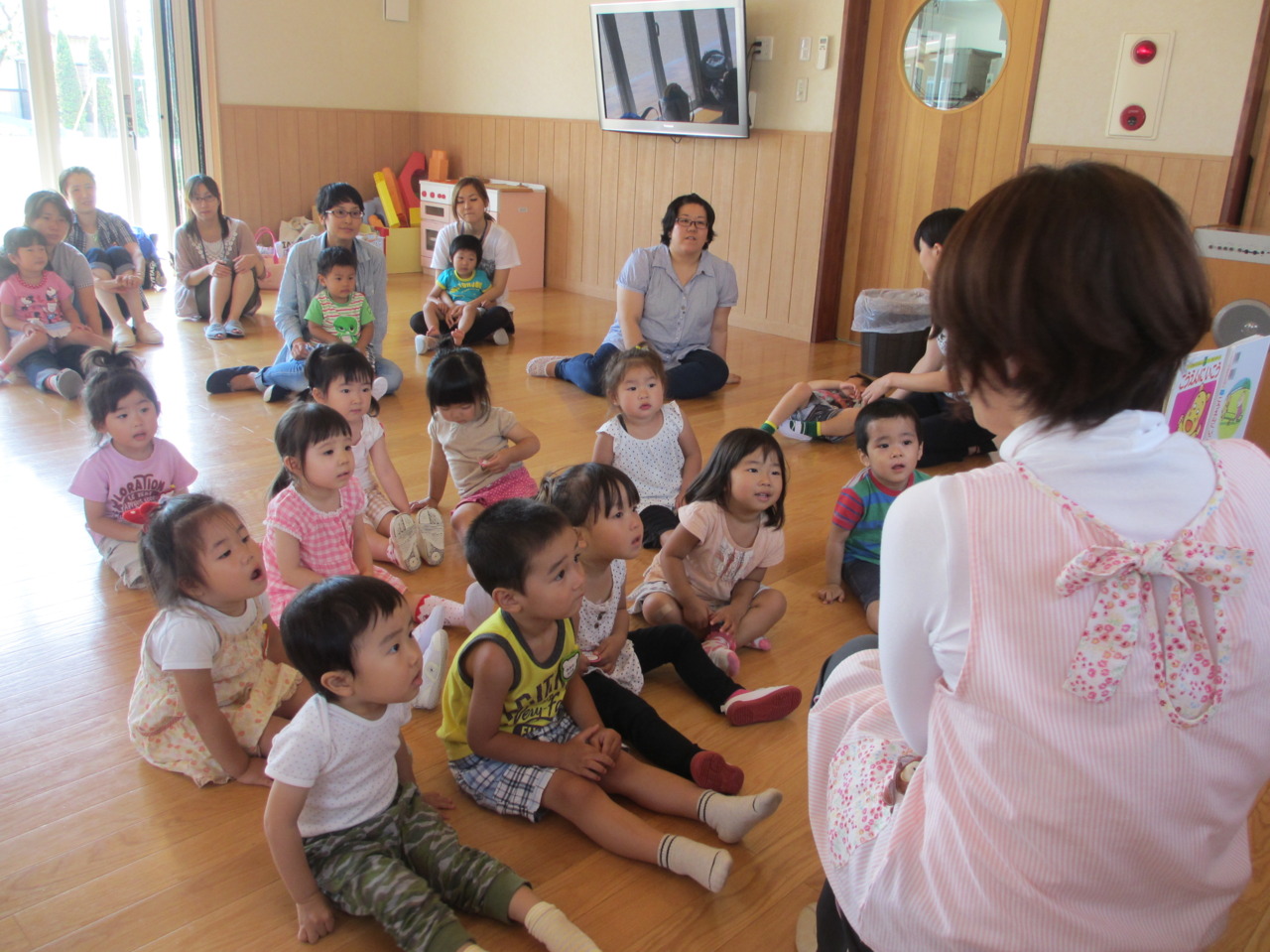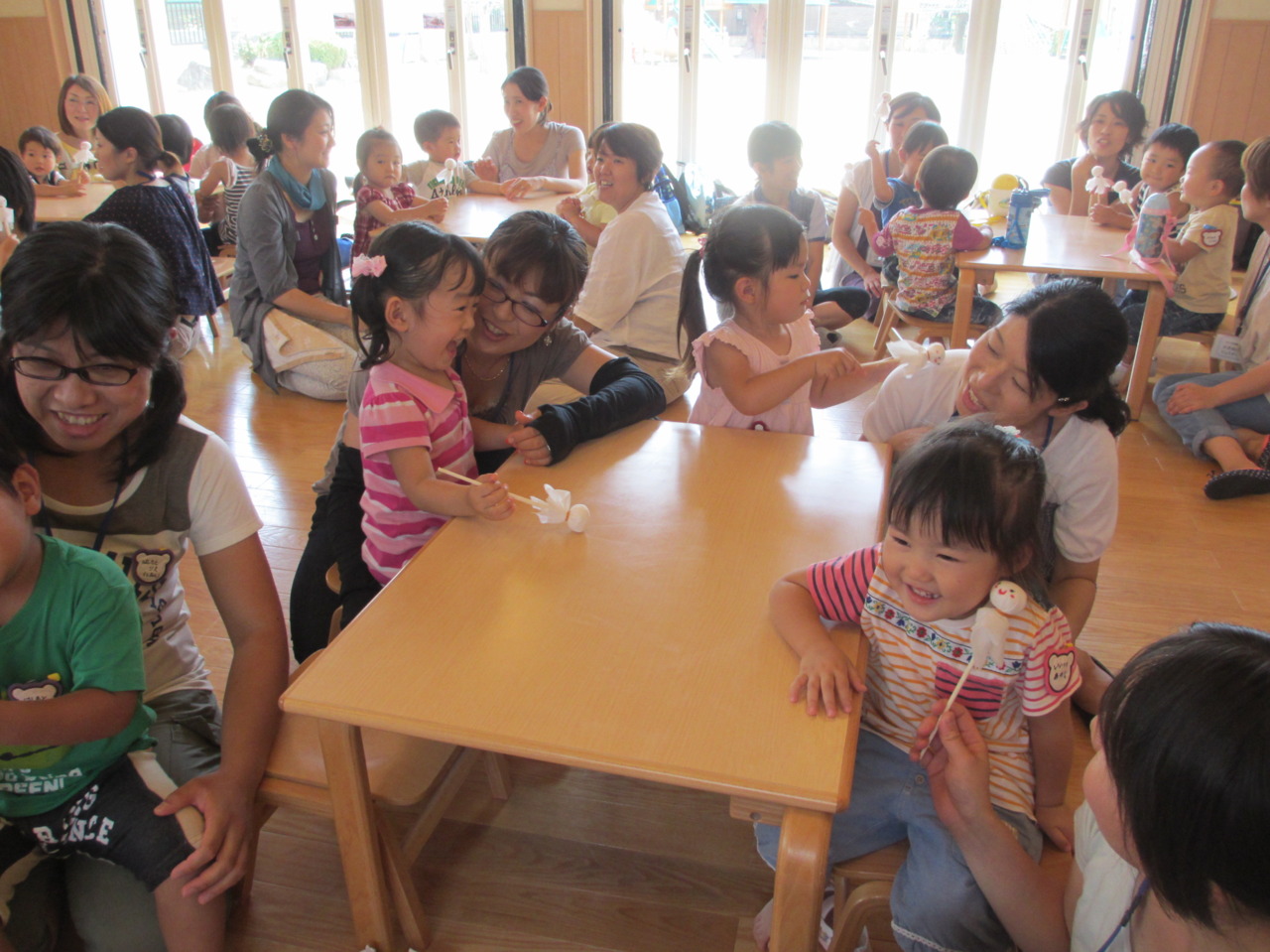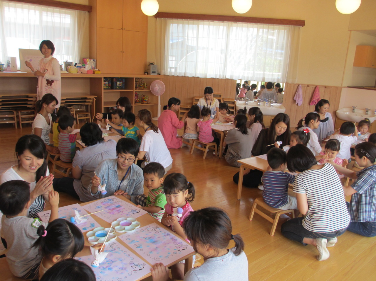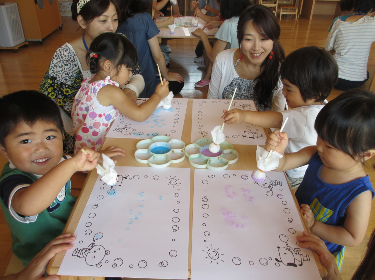 お部屋では、タンポでトントンと紙の上にシャボン玉をとばしました。淡い水色と紫色がとってもきれいでしたね!