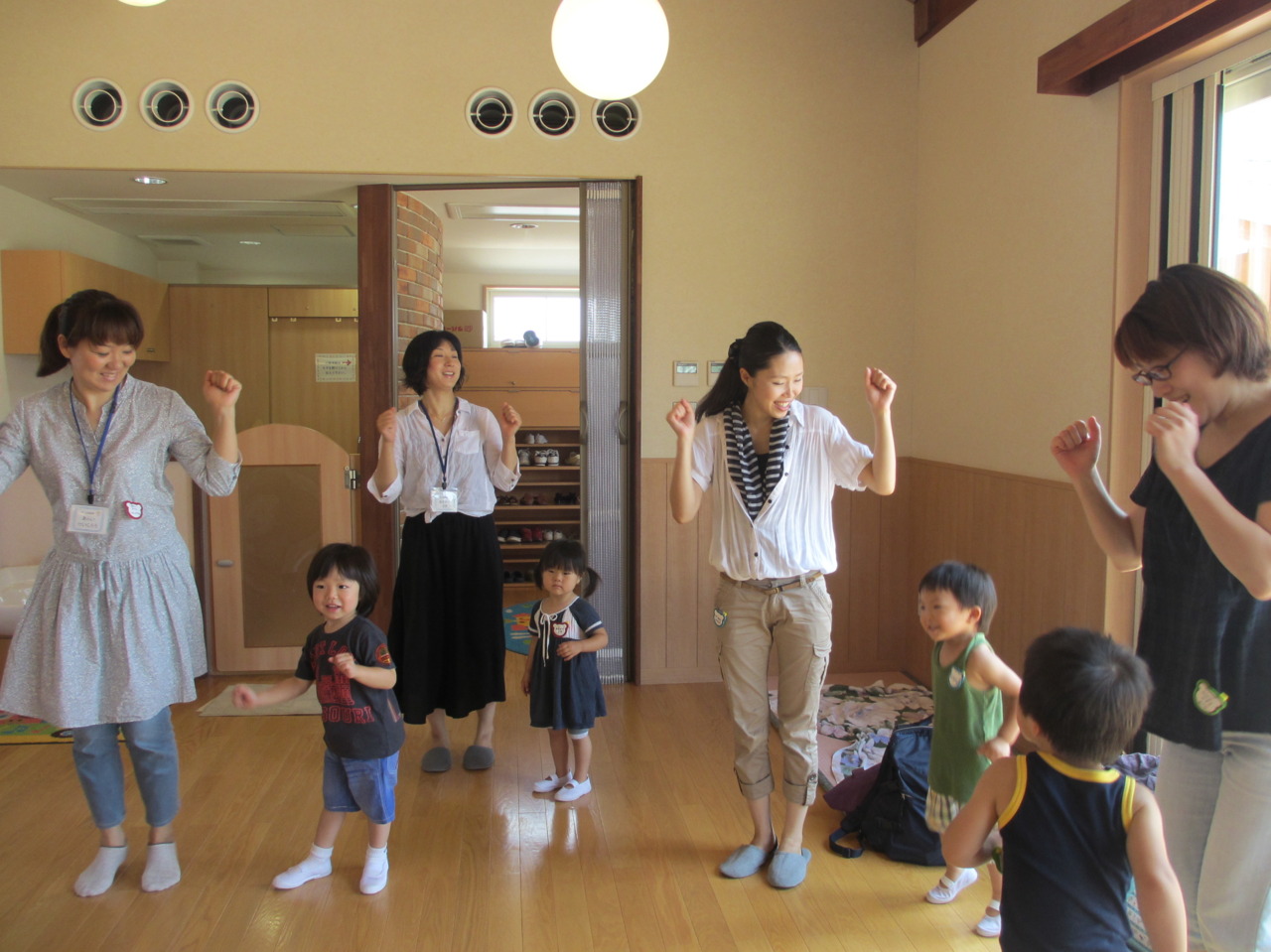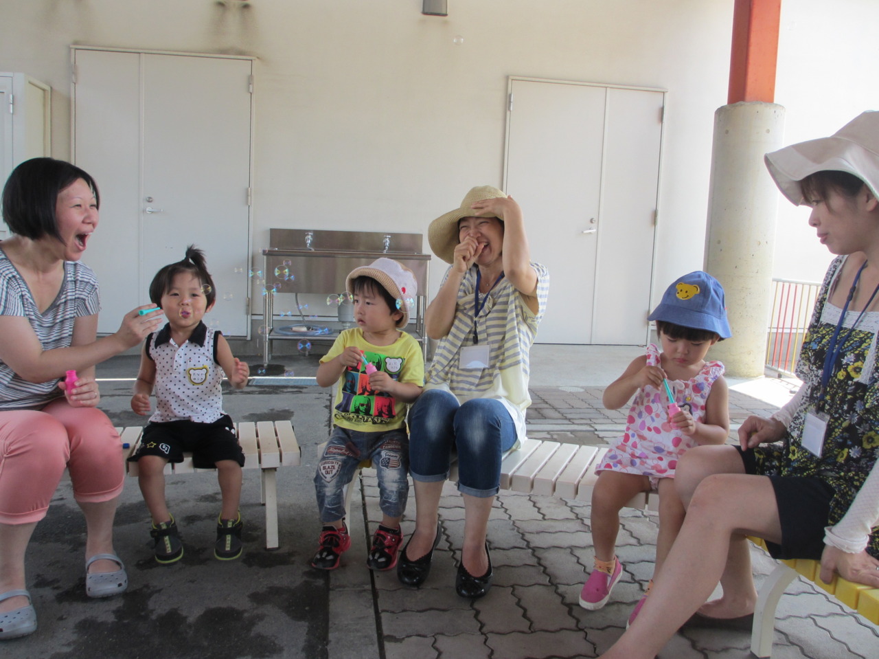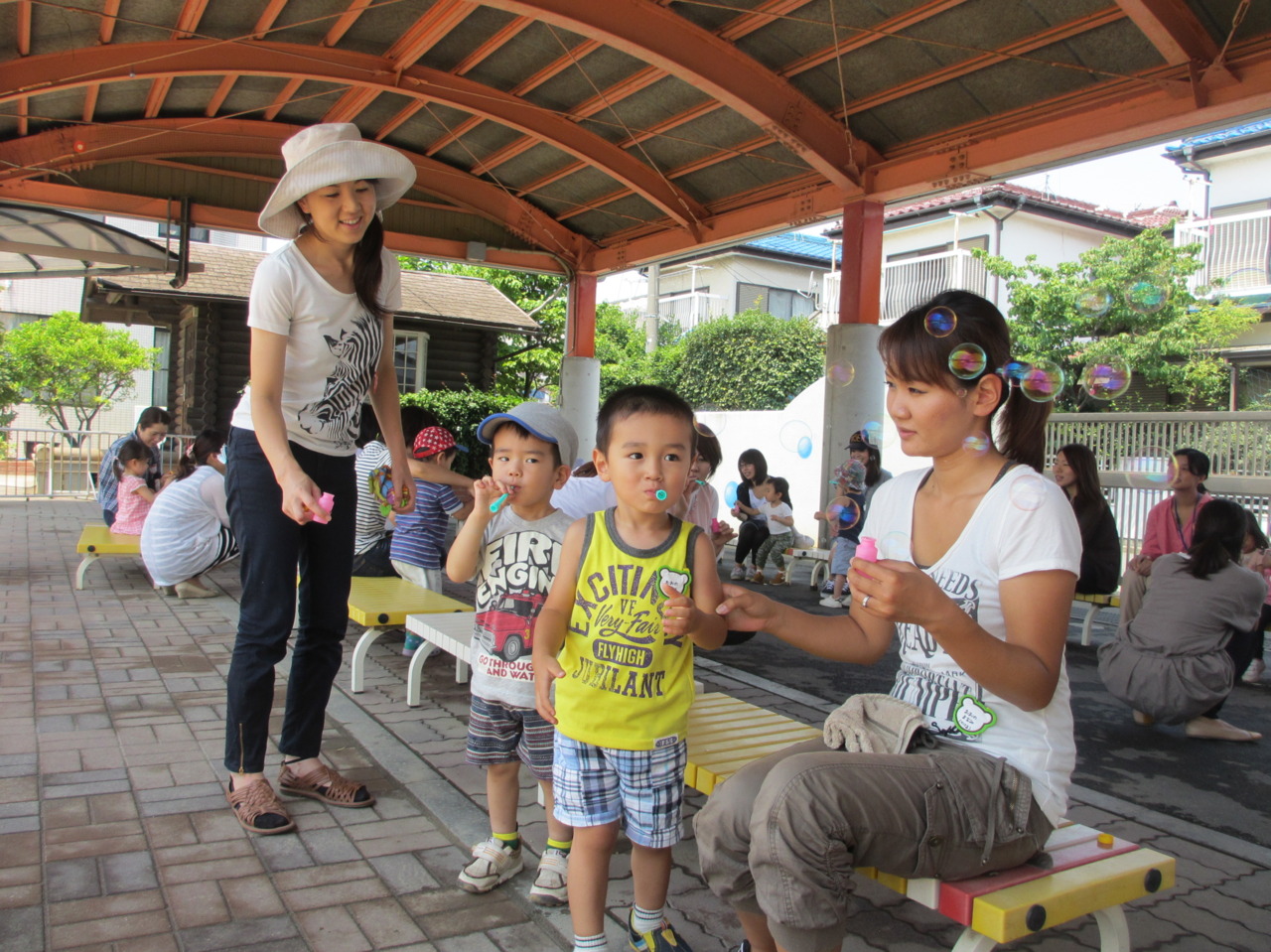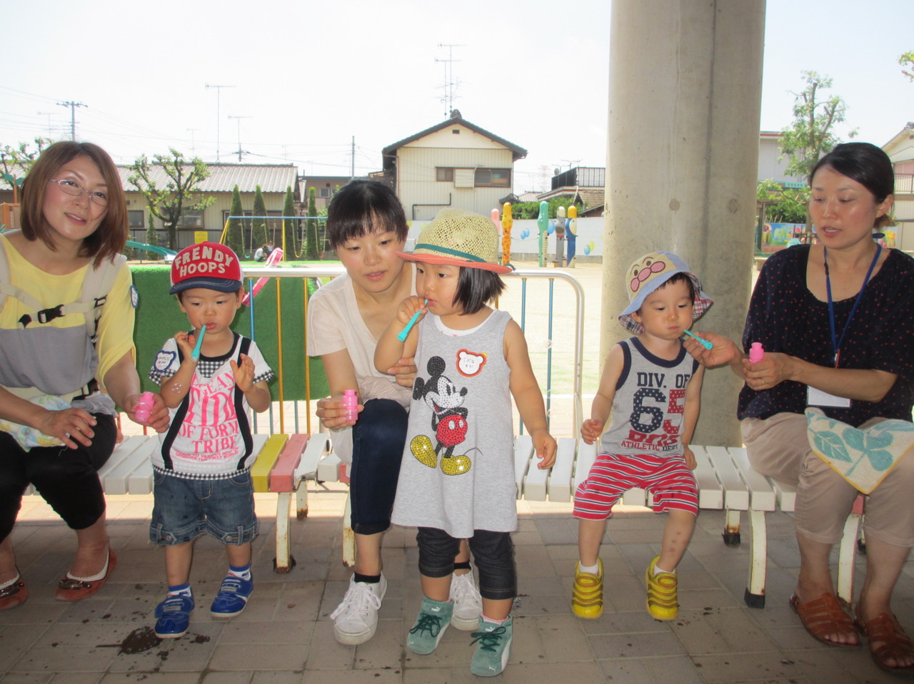 その後は、お外でシャボン玉とばしをしました。色とりどりのシャボン玉に大喜びでした(^O^)/みんな上手でしたよ♪