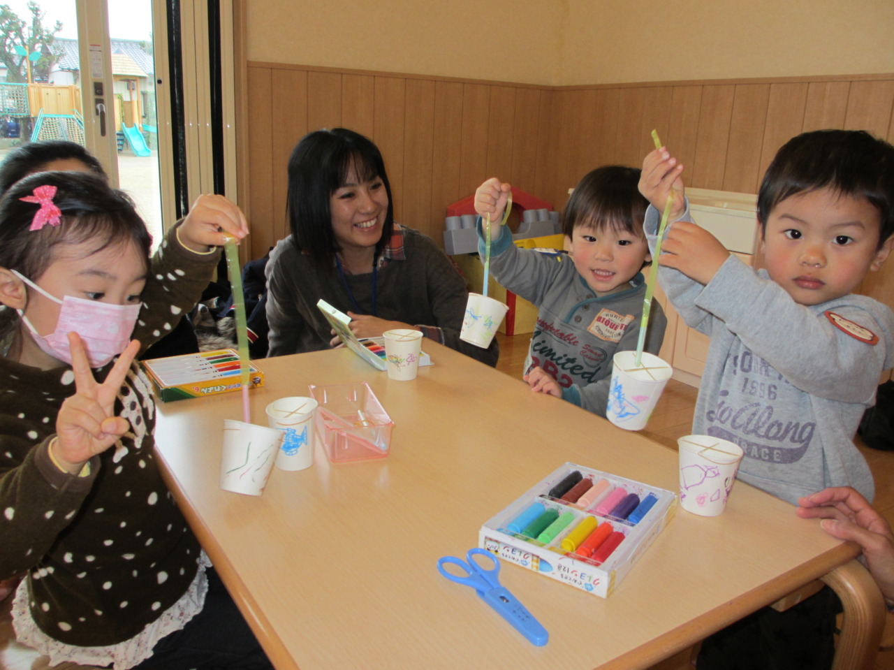 今週は、ストローや紙コップなど身近な素材を使っておもちゃ作りを行いました。