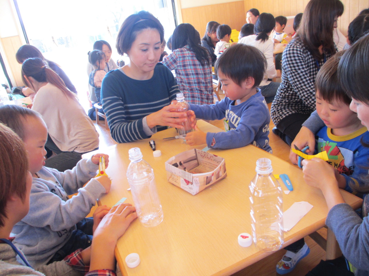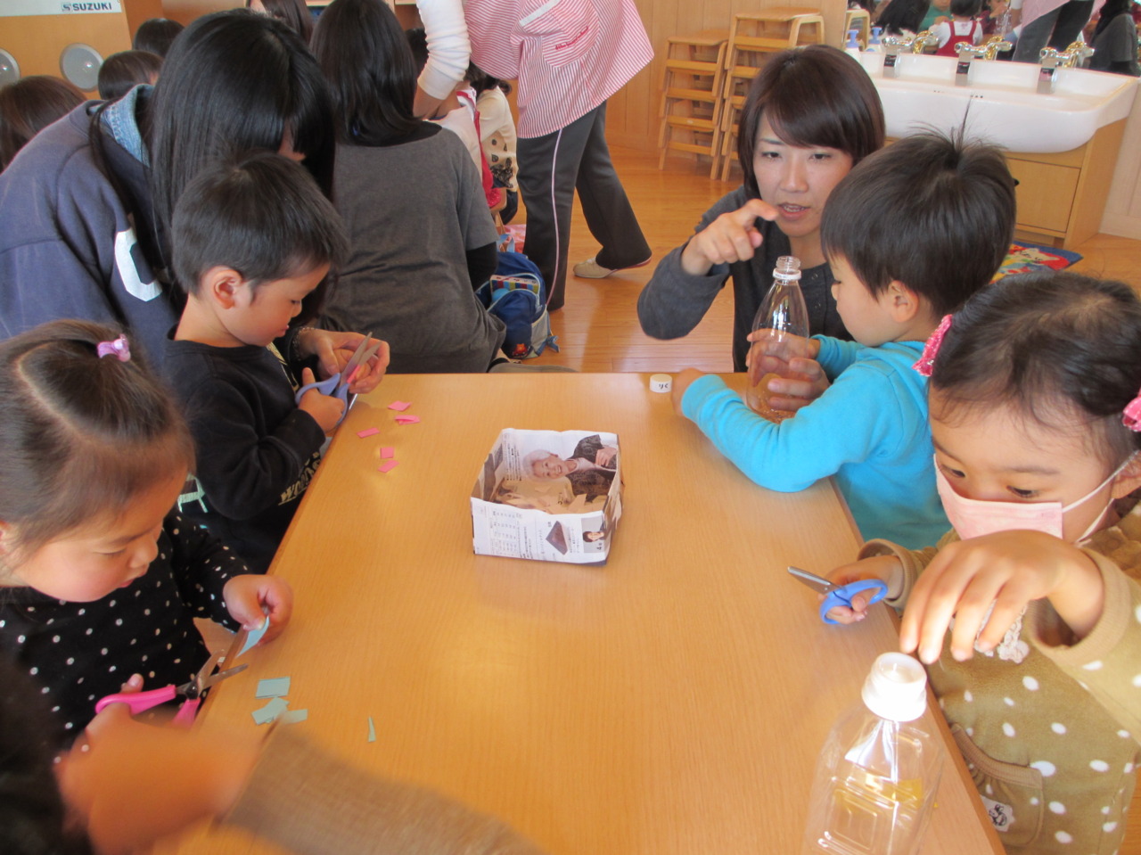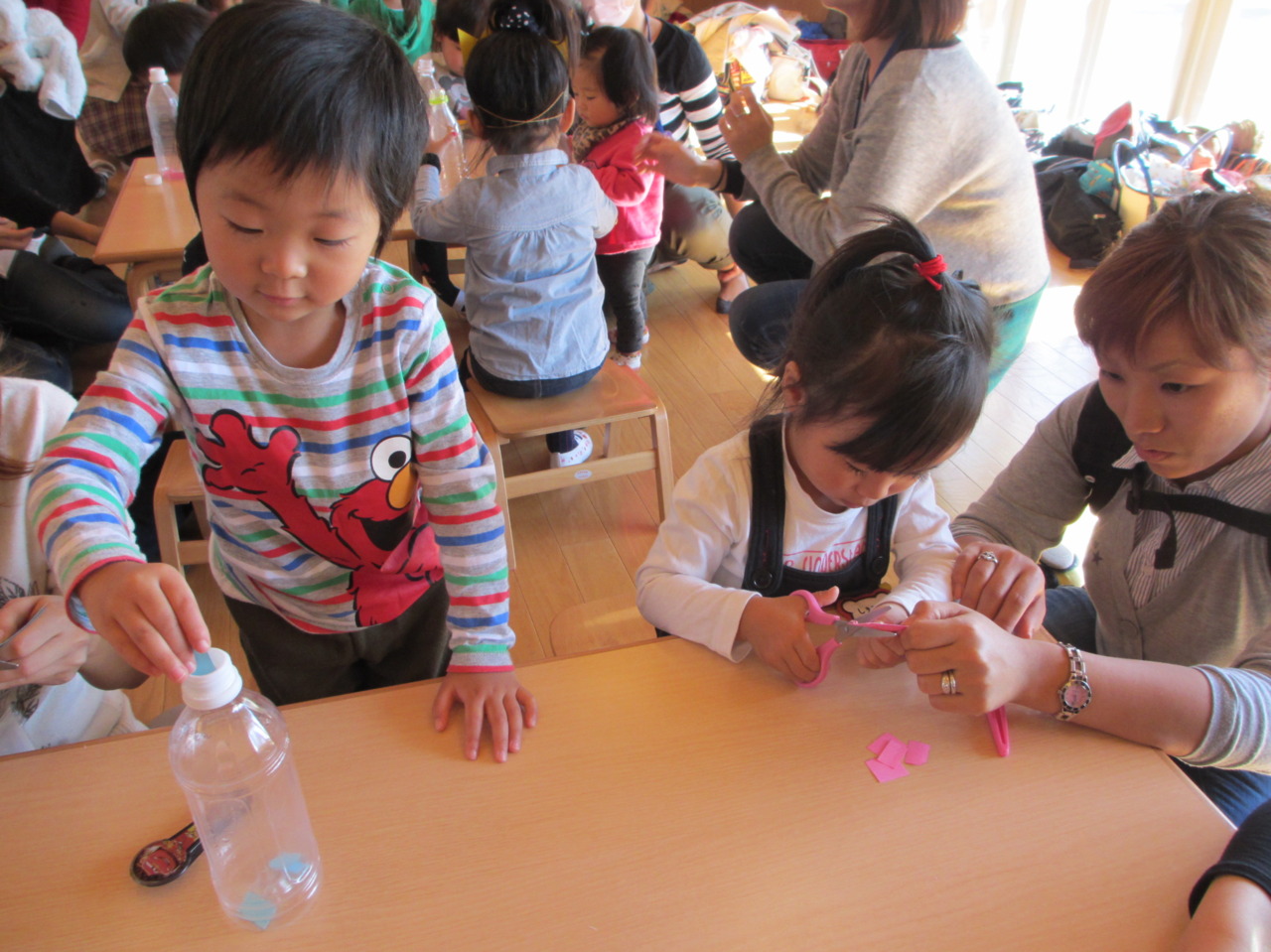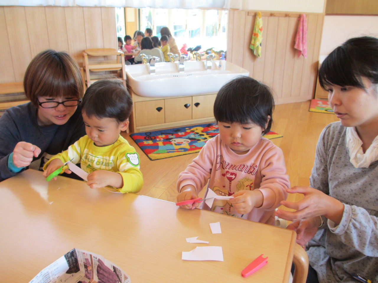 お母さんに見てもらいながら、ハサミの練習です。