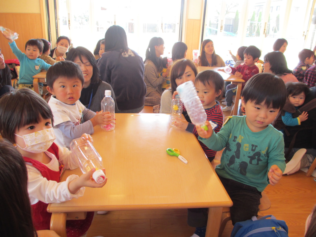 ペットボトルの中に切った色画用紙・お米・あずき・どんぐりが入った素敵なマラカスが出来上がりました♪
