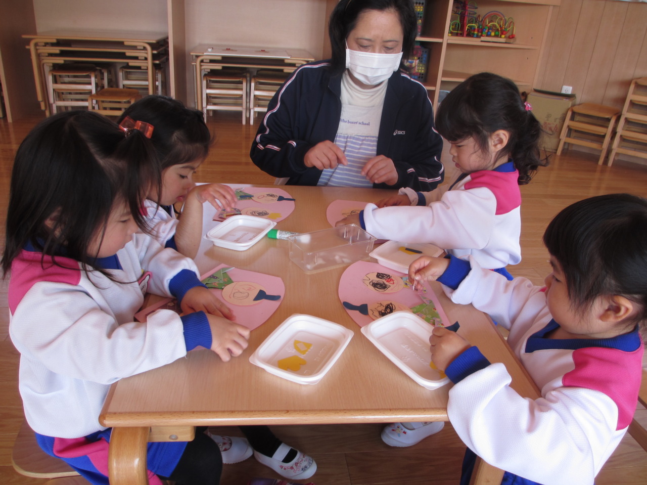 お雛様にかんむりをつけて、お内裏様にえぼしをつけて・・・だんだんお雛様らしくなってきましたね(*^_^*)