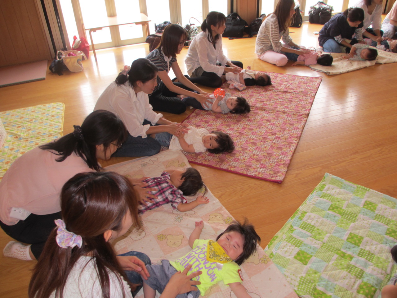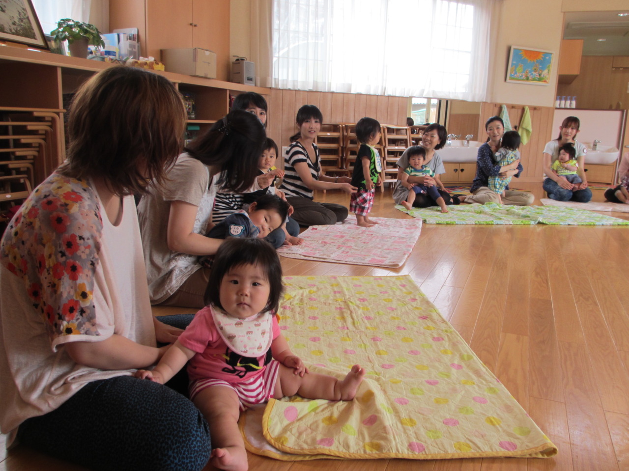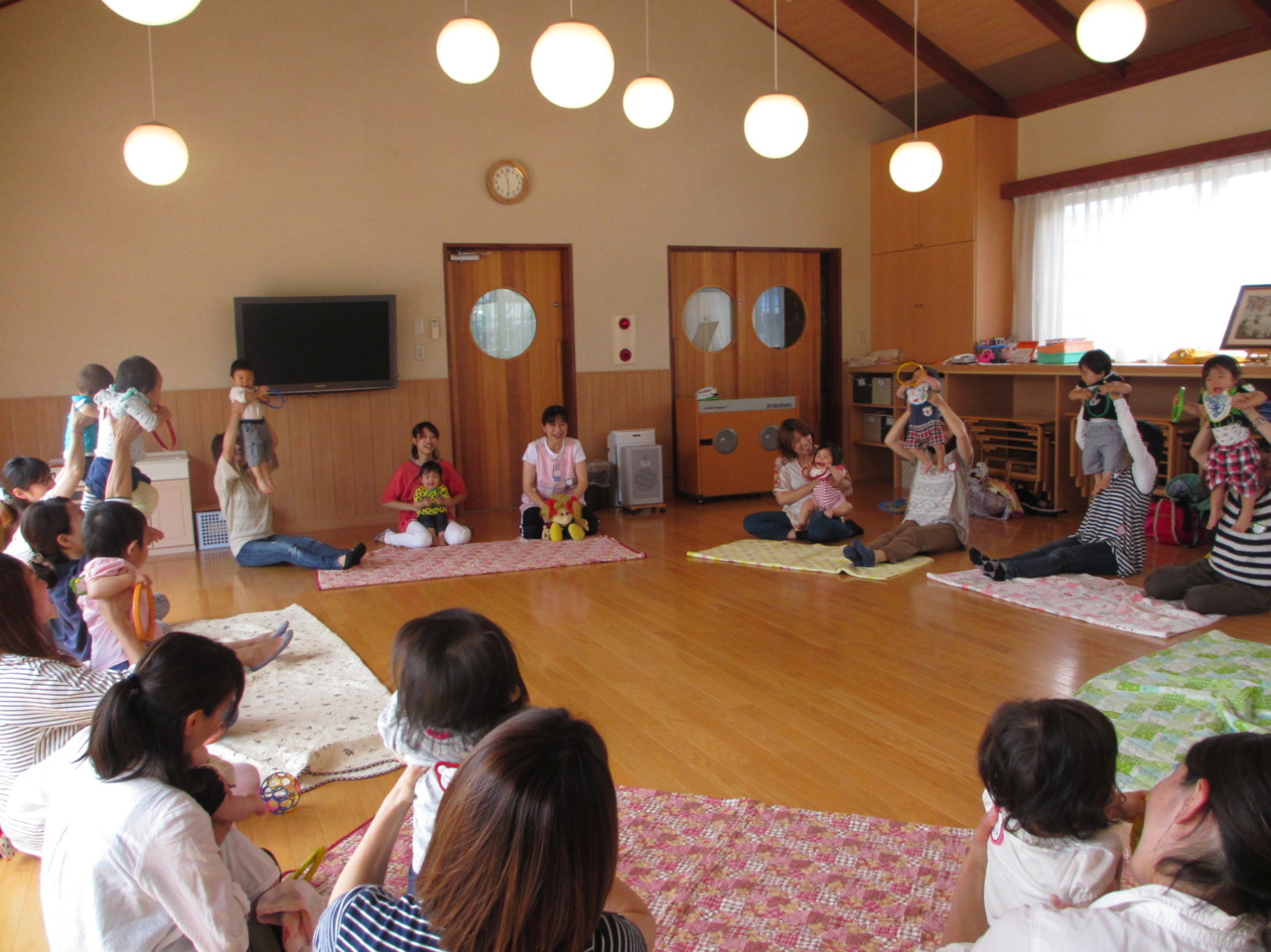 今日は、お名前呼びをしてみました!! 「○○ちゃん!」「は~い!」 お母さんと一緒に手をあげてもらい、とっても上手にお返事できましたね♪