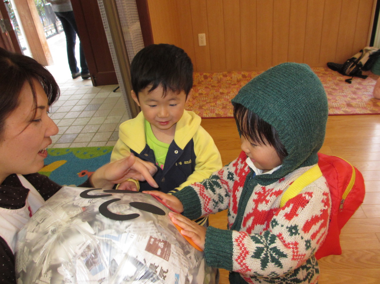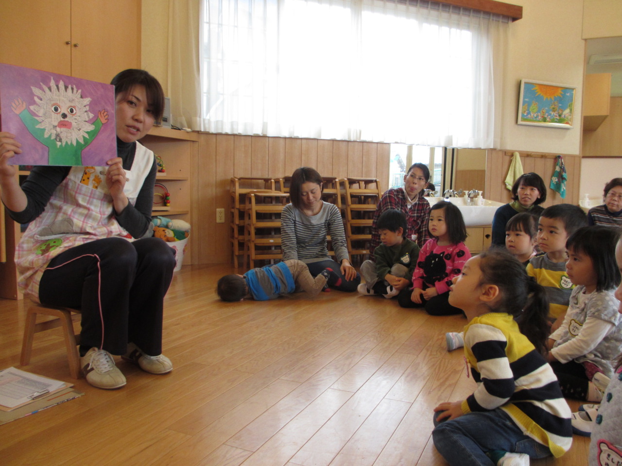 今回は新聞紙あそびの前に紙芝居を見ました。