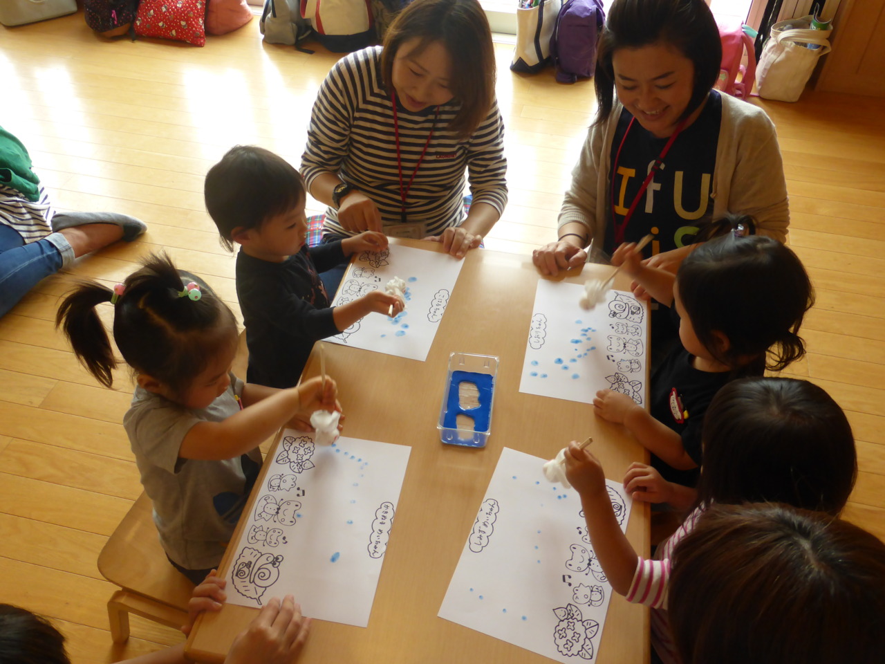 てるてるぼうずのタンポに絵の具をつけて・・・
