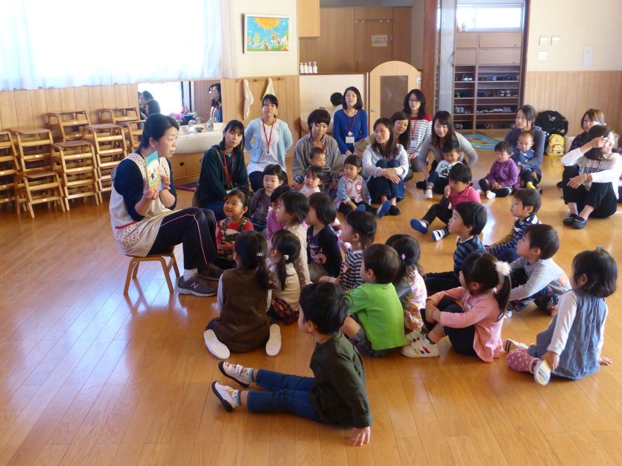 お母さんから離れて、静かに見られます。