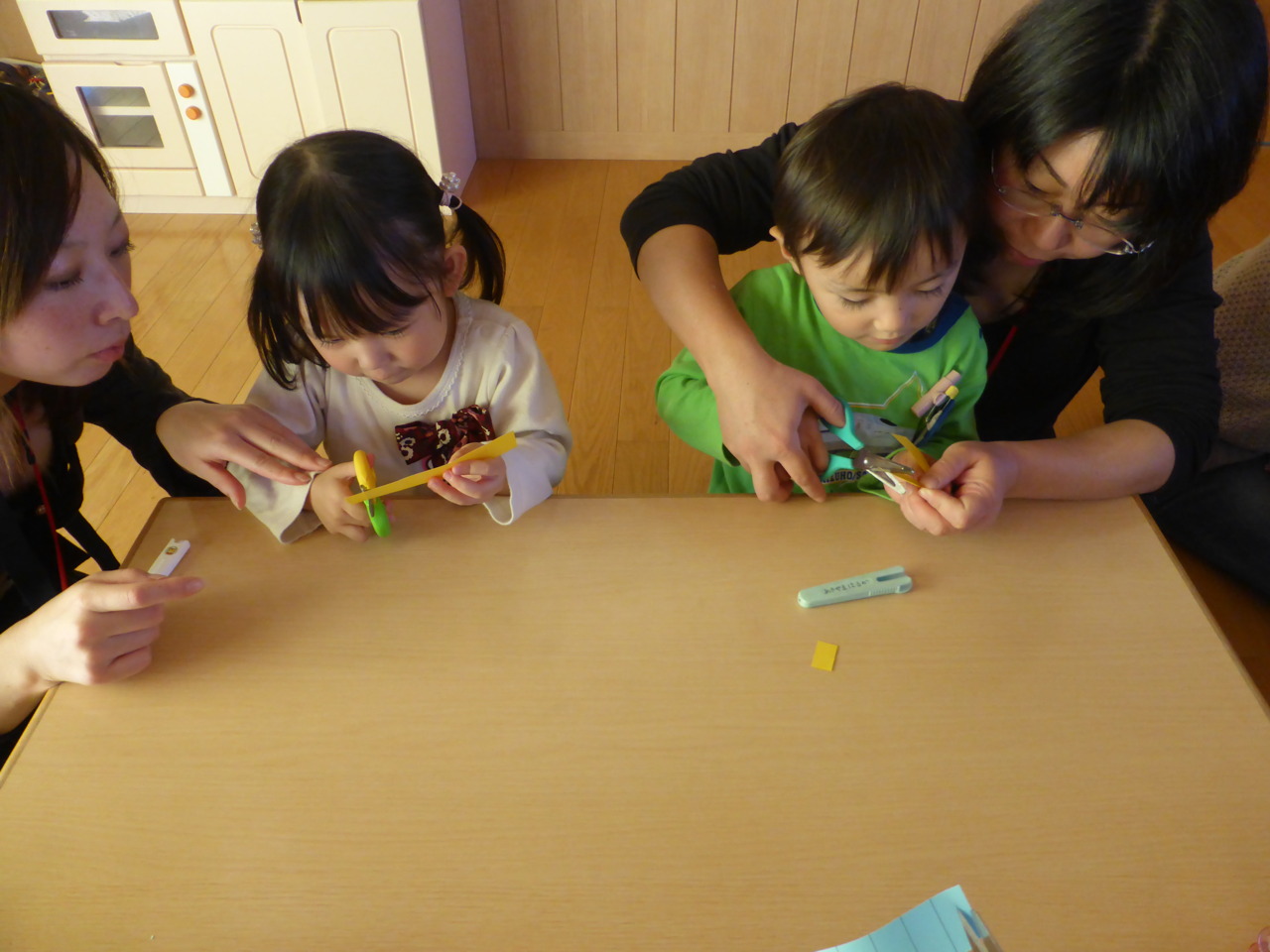 今回のクラブは、初めて「ハサミ」を使って製作をしました。正しい使い方を覚えて、みんな上手に紙を切ることが出来ました。