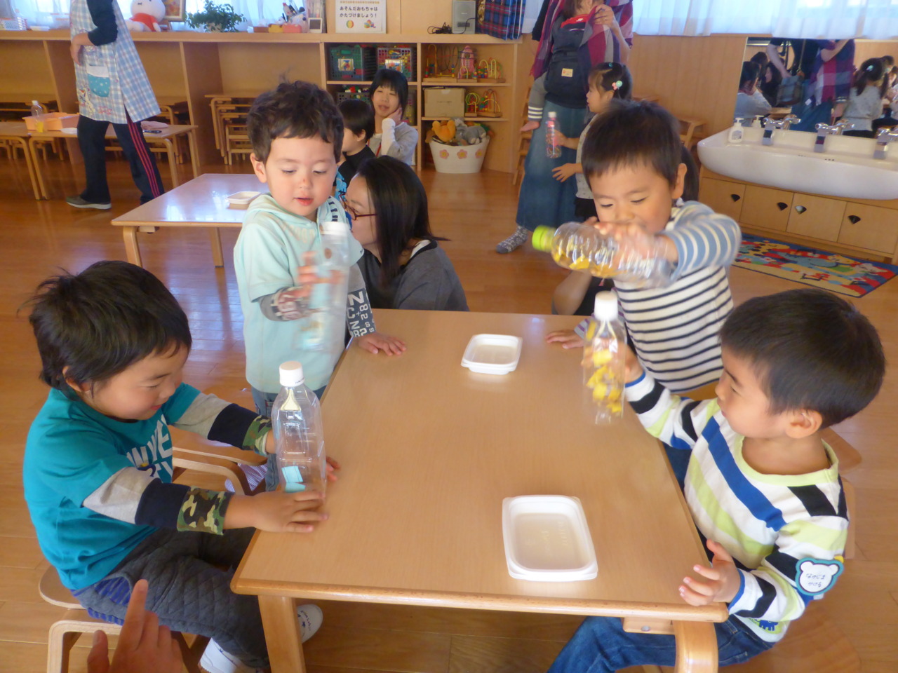 とうもろこしも入れました。小さい粒を集中して入れている様子は、みんな真剣(^^)