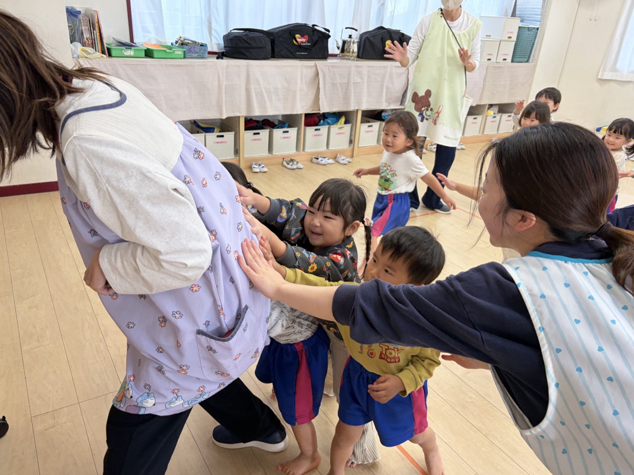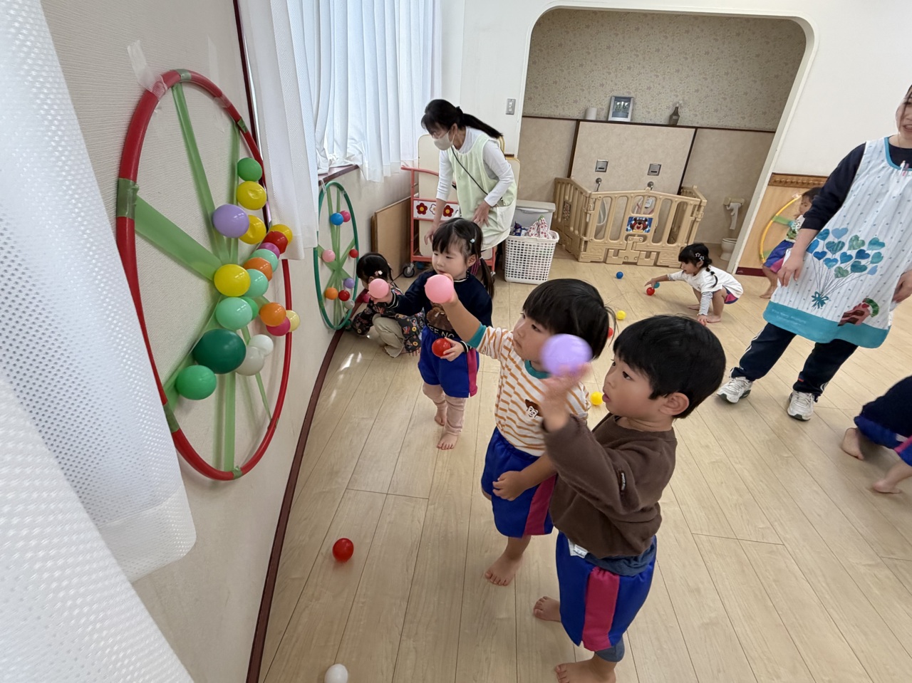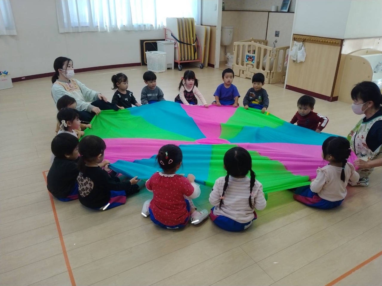 火曜日に「パラバルーン」で遊びました。 たて波、よこ波、おまんじゅう・・・ 音楽に合わせてパタパタ上手に出来ました♪