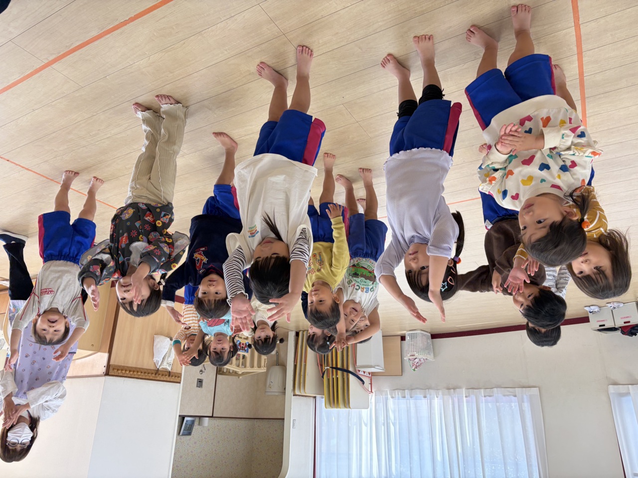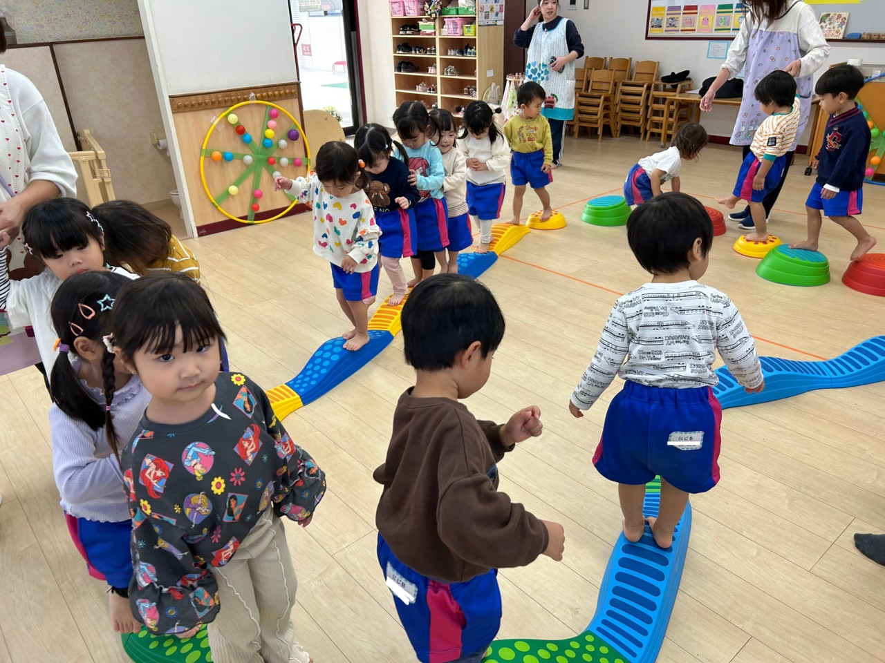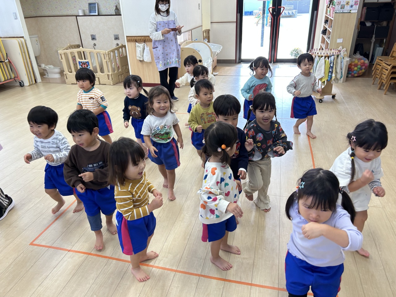 火曜日に「パラバルーン」で遊びました。 たて波、よこ波、おまんじゅう・・・ 音楽に合わせてパタパタ上手に出来ました♪