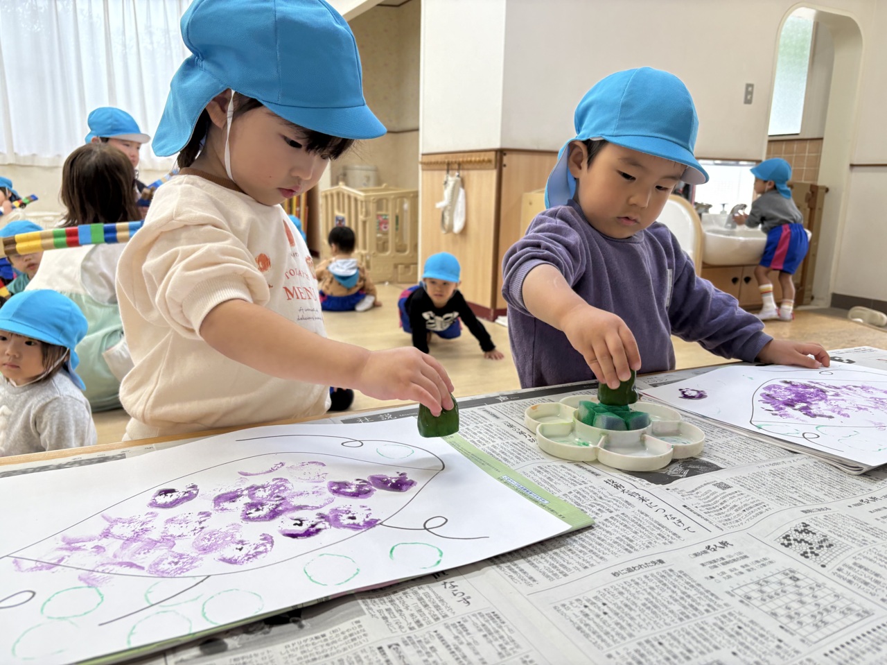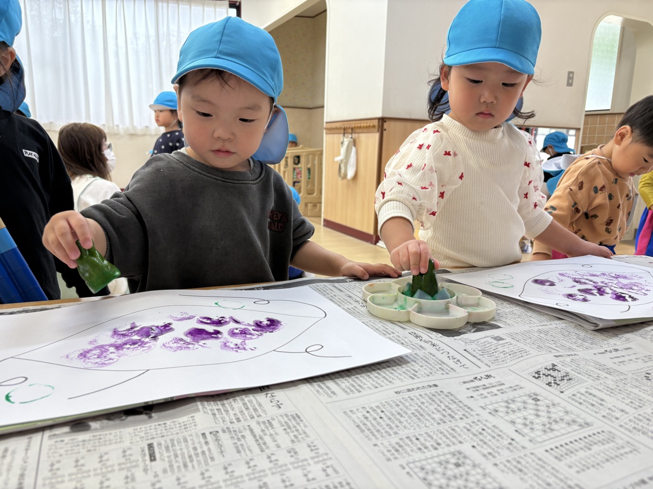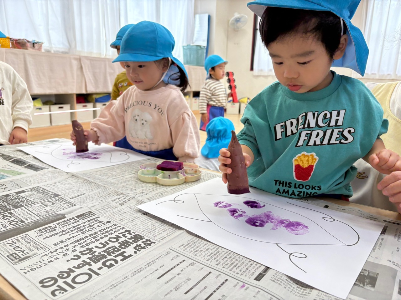 お芋に紫色の絵の具をつけて、ポンポンポン 大きなお芋が出来ちゃった!