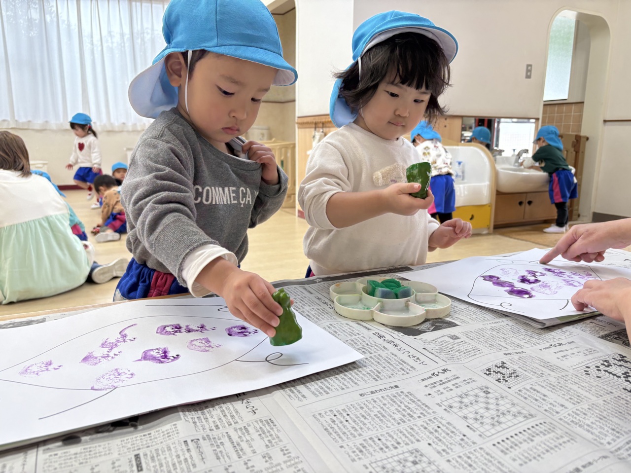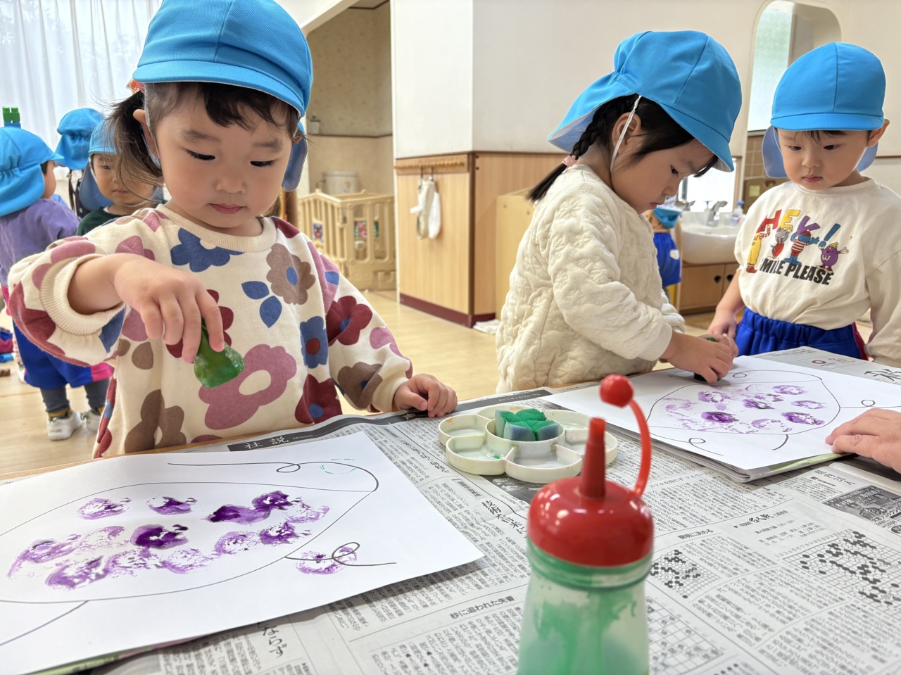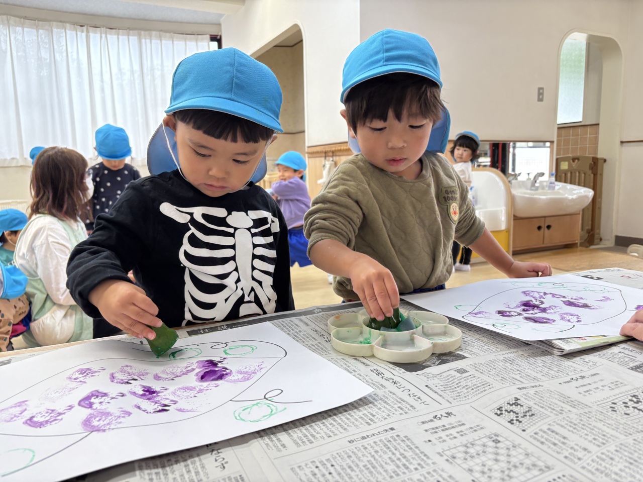 お芋に紫色の絵の具をつけて、ポンポンポン 大きなお芋が出来ちゃった!